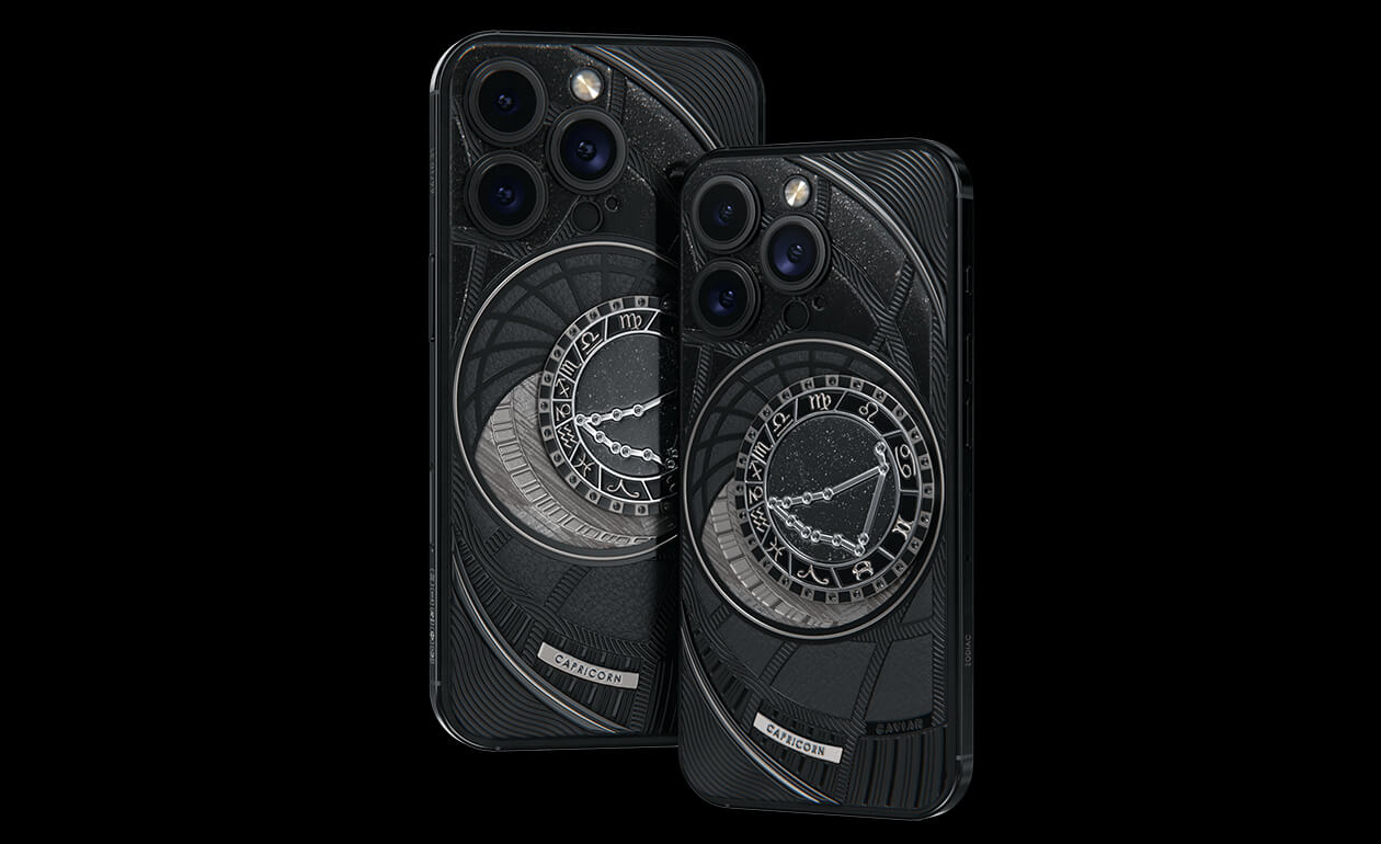 Козероги, сегодня мы представляем вам Capricorn. На корпусе смартфона есть небесный свод с вашими звездами. Это панно из 24 черных циркониев, созданное на титане с PVD-покрытием. Мы подчеркнули сияние россыпи черных бриллиантов с помощью композита с узором звезд и завершили композицию фрагментом метеорита на телячьей коже классического черного цвета.