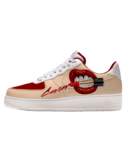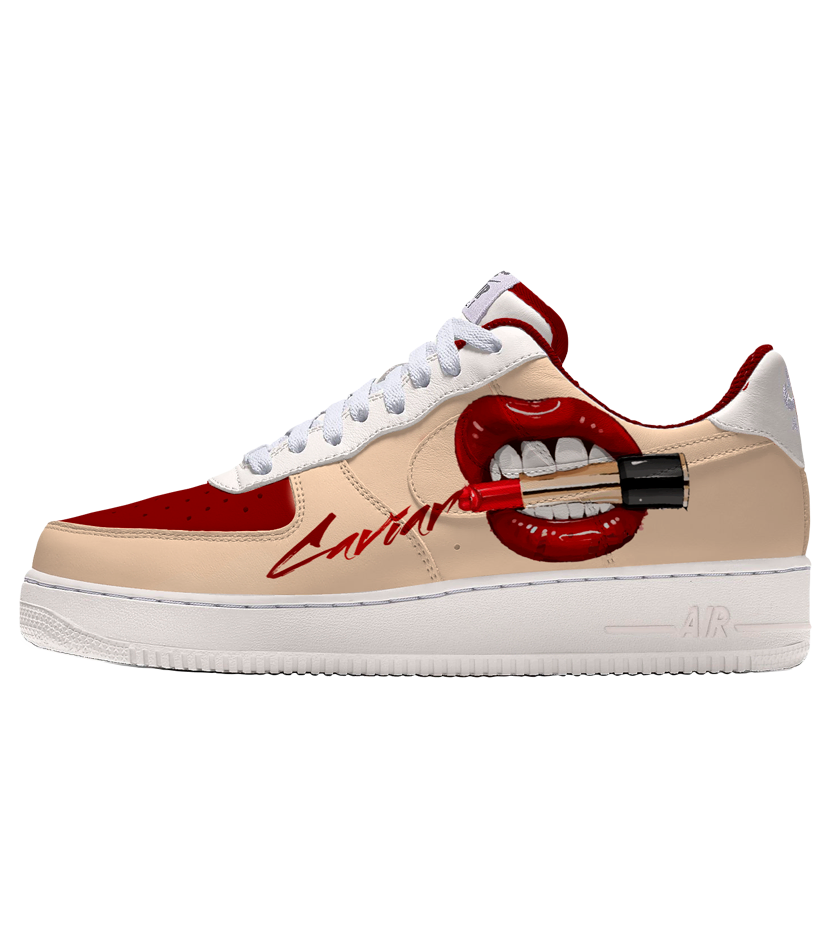 Кастомные кроссовки Caviar Nike Air Force 1 Rave Grin, с алым оскалом губ и нежным нюдовым фоном, созданы для ярких девчонок. Белая футболка и синие джинсы с белыми кроссами - скучно. Белая футболка и синие джинсы с расписанными вручную кастомными кроссы - и ты королева стрит-стайла.