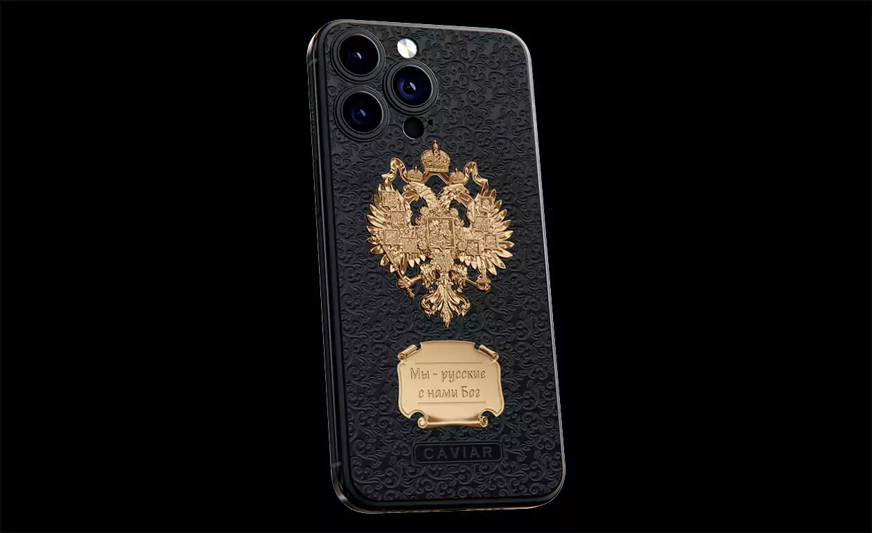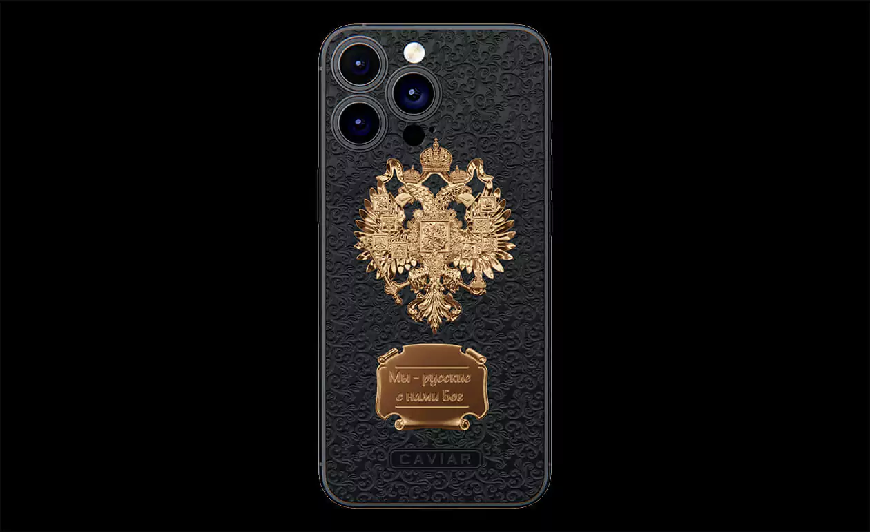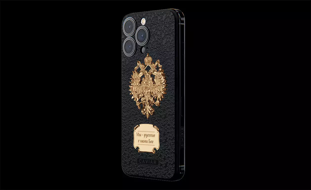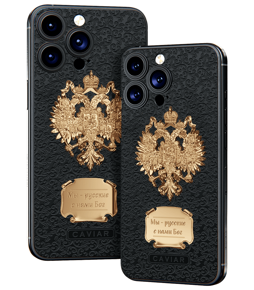 Дизайнеры Caviar изобразили на корпусе смартфона харизматичный, гордый и, пожалуй, даже воинственный Герб Российской Империи и дополнили дизайн надписью «Мы русские с нами бог». Слова, принадлежащие Александру Суворову — яркая мысль об особой защите и великой миссии, дарованным России свыше. Выразительная композиция дополнена рельефным фоном из черного композитного оникса, на котором выгравированы изящные узоры в традиционном русском стиле.