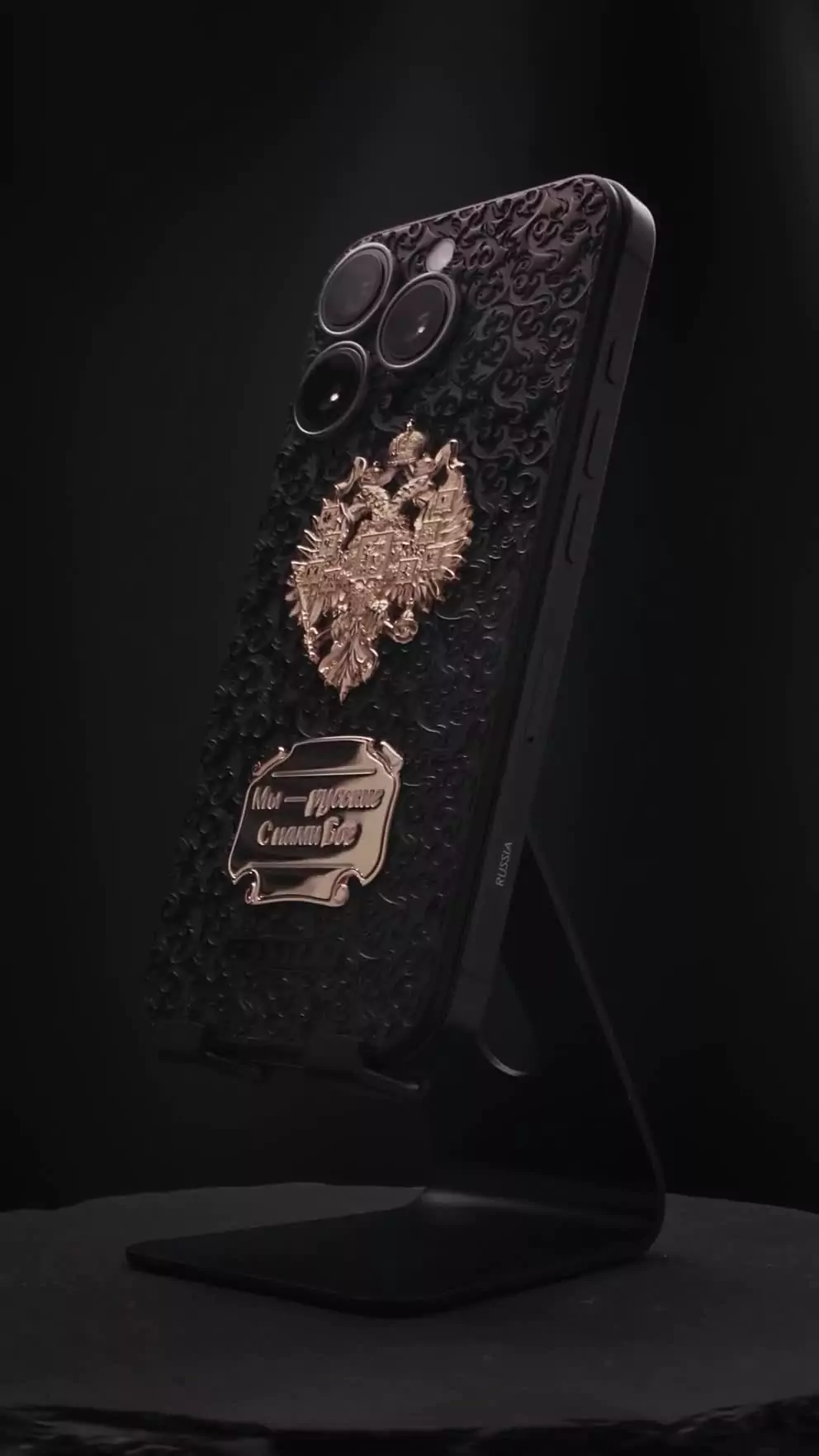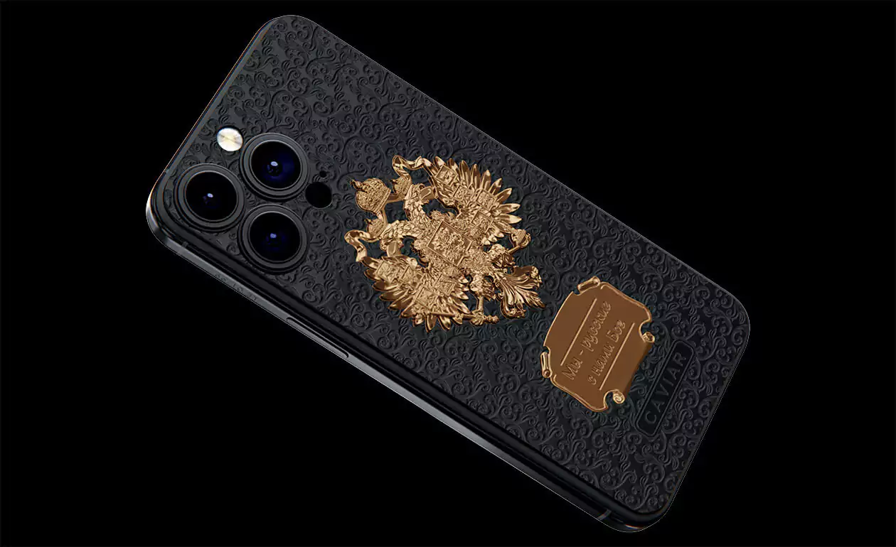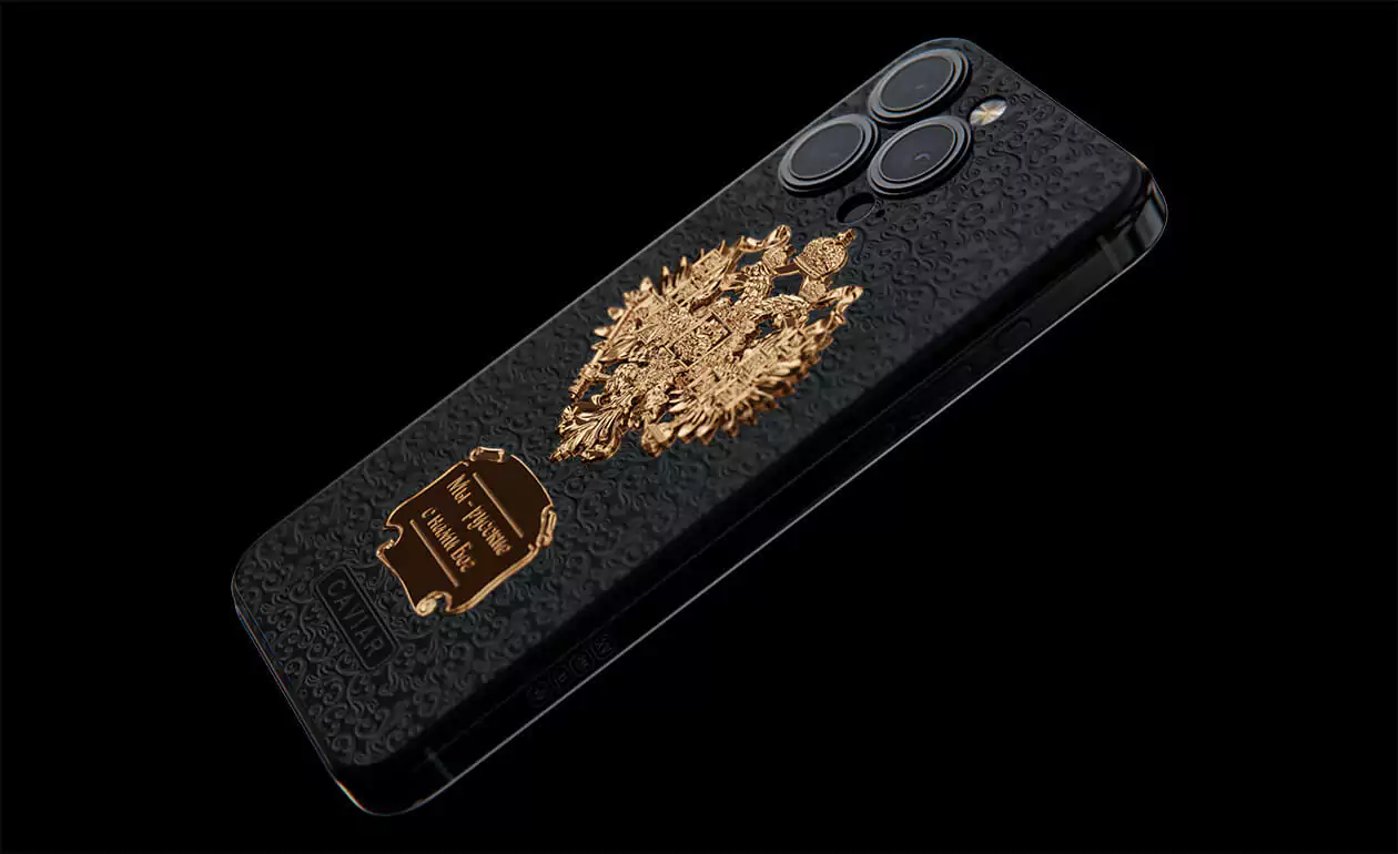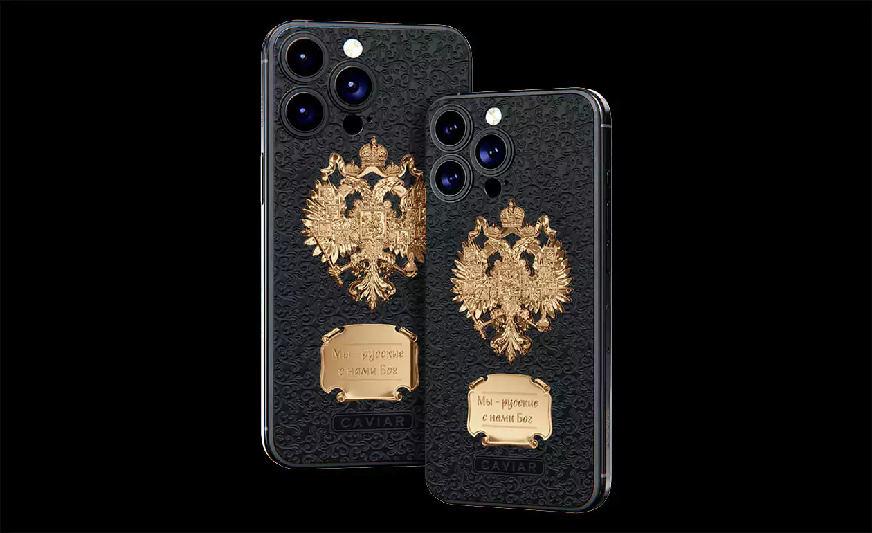 Дизайнеры Caviar изобразили на корпусе смартфона харизматичный, гордый и, пожалуй, даже воинственный Герб Российской Империи и дополнили дизайн надписью «Мы русские с нами бог». Слова, принадлежащие Александру Суворову — яркая мысль об особой защите и великой миссии, дарованным России свыше. Выразительная композиция дополнена рельефным фоном из черного композитного оникса, на котором выгравированы изящные узоры в традиционном русском стиле.