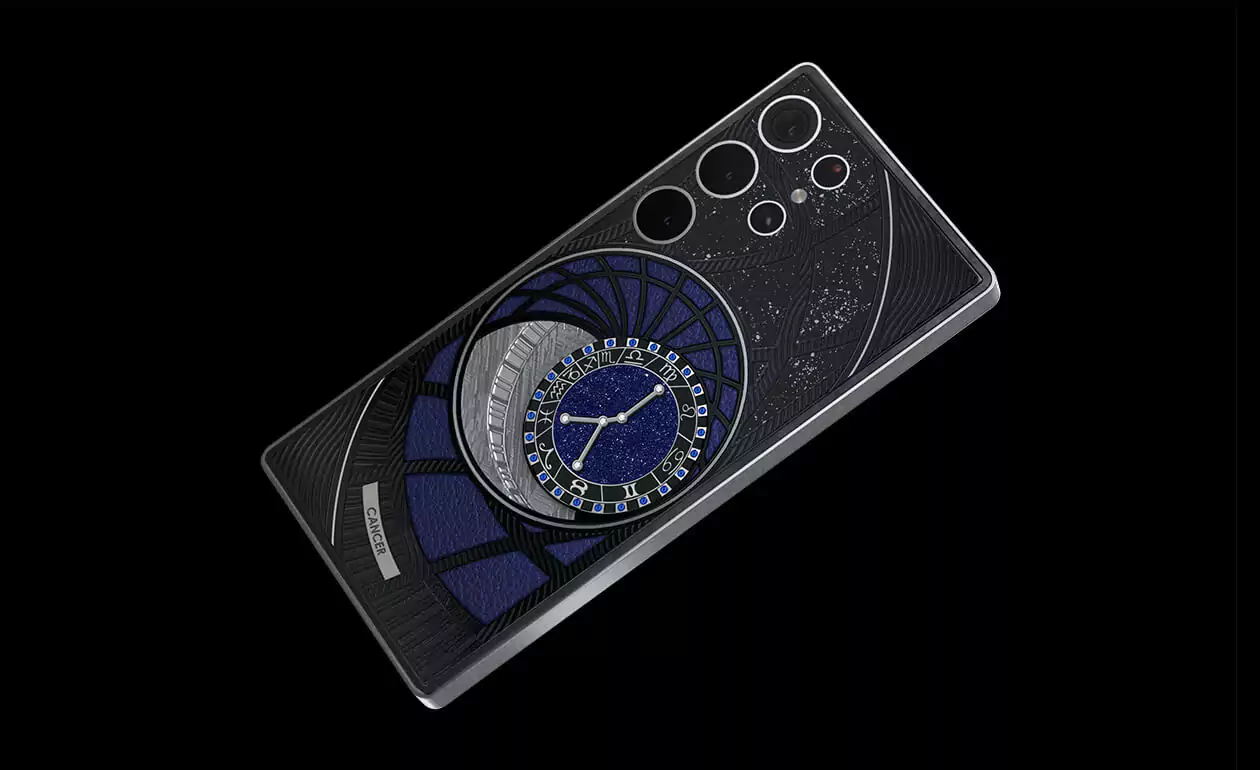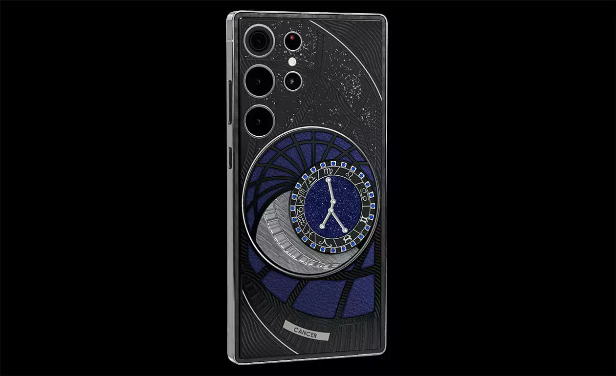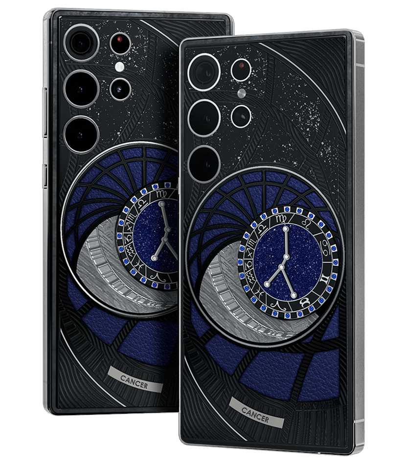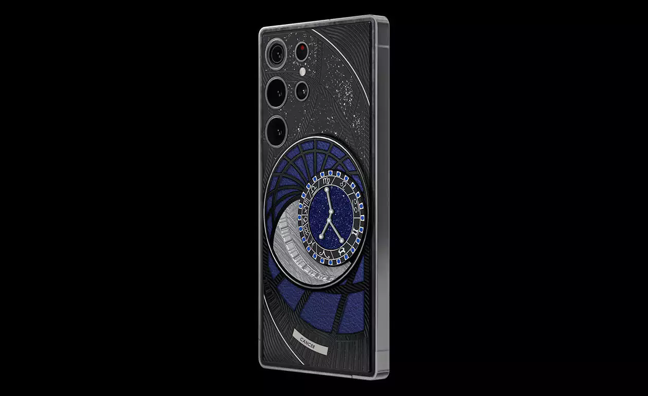На корпусе смартфона есть небесный свод с вашими звездами. Это панно из 24 сапфиров, созданное на черном титане с PVD-покрытием. Мы подчеркнули сияние сапфировой россыпи с помощью синего искусственного камня и завершили композицию фрагментом метеорита на телячьей коже в ярком оттенке индиго.