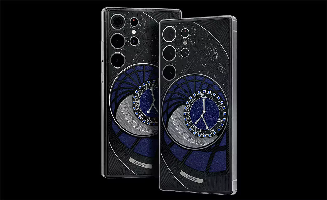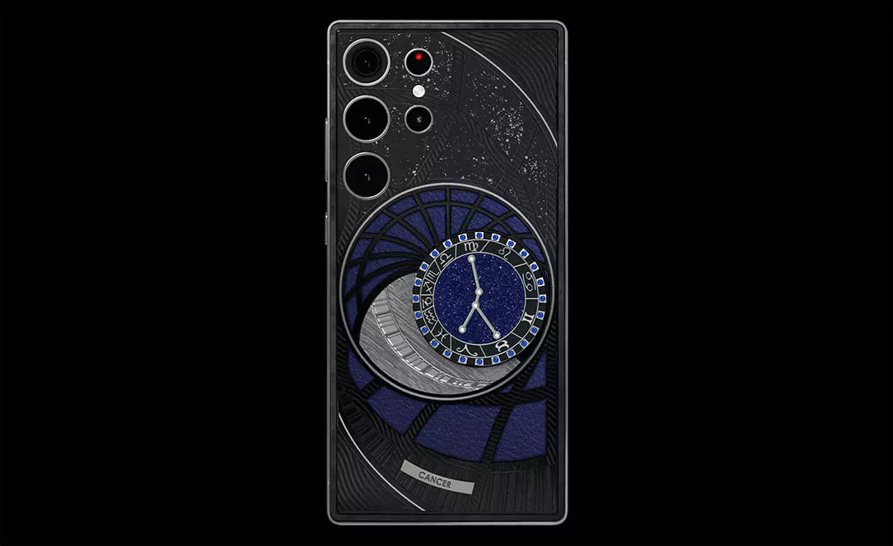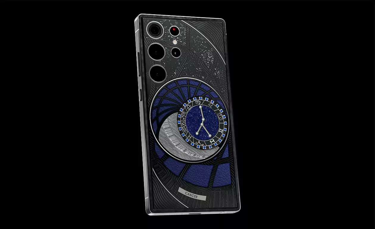 На корпусе смартфона есть небесный свод с вашими звездами. Это панно из 24 сапфиров, созданное на черном титане с PVD-покрытием. Мы подчеркнули сияние сапфировой россыпи с помощью синего искусственного камня и завершили композицию фрагментом метеорита на телячьей коже в ярком оттенке индиго.