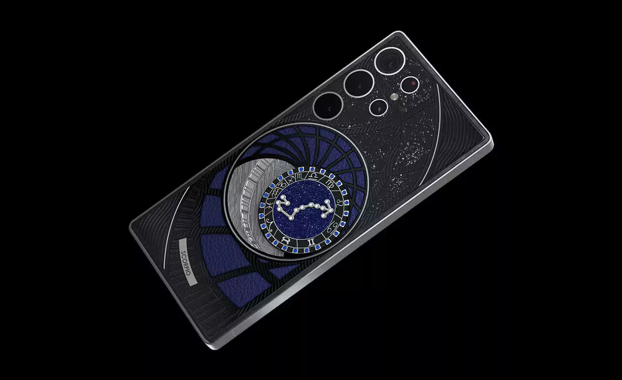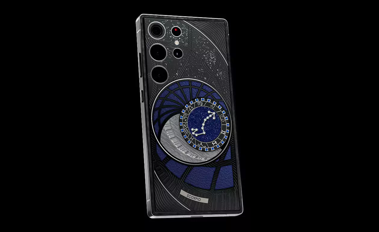 На корпусе смартфона есть небесный свод с вашими звездами. Это панно из 24 сапфиров, созданное на черном титане с PVD-покрытием. Мы подчеркнули сияние сапфировой россыпи с помощью синего искусственного камня и завершили композицию фрагментом метеорита на телячьей кожи в ярком оттенке индиго.