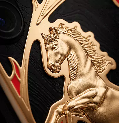 Вздыбленный конь в центре композиции олицетворяет готовность к прыжку и покорению новых вершин. Языки пламени, обрамляющие фигуру, символизируют страсть к своему делу и неиссякаемый источник внутренней энергии.