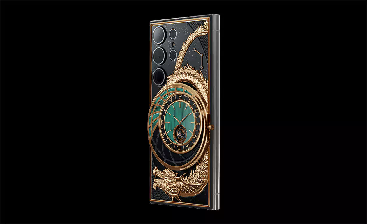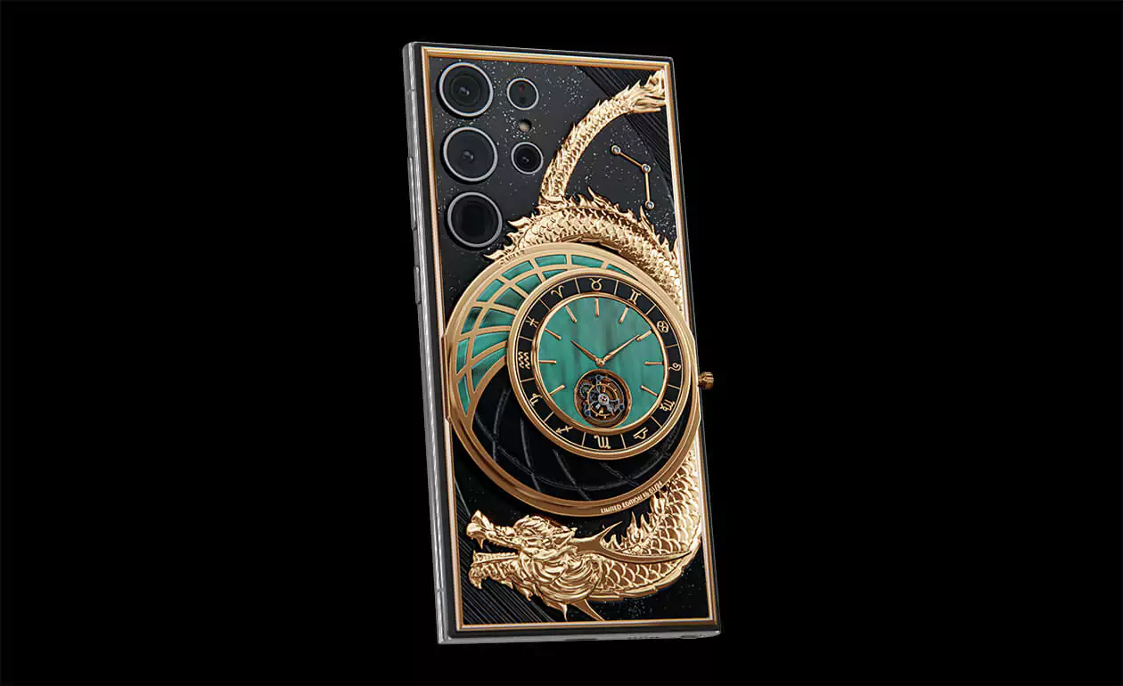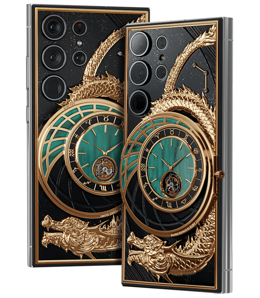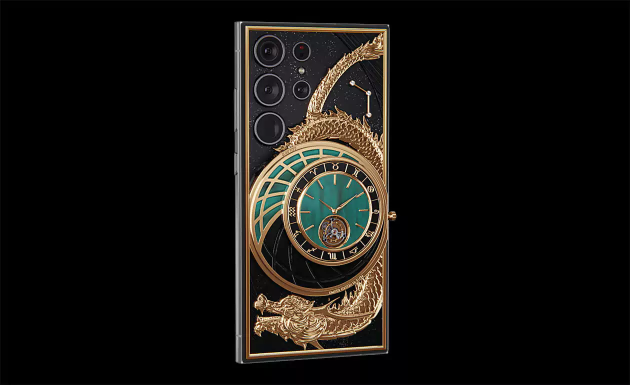 Корейский золотой дракон, три звезды Samsung в виде сияющих бриллиантов, механические часы с турбийоном как воплощение новой эры для компании, а также гравировка звездного неба на титановом полотне. Зеленый цвет циферблата означает возрождение, процветание и наступление нового года. Зодиакальный круг – влияние звезд на успех и господство Samsung в мире технологий.