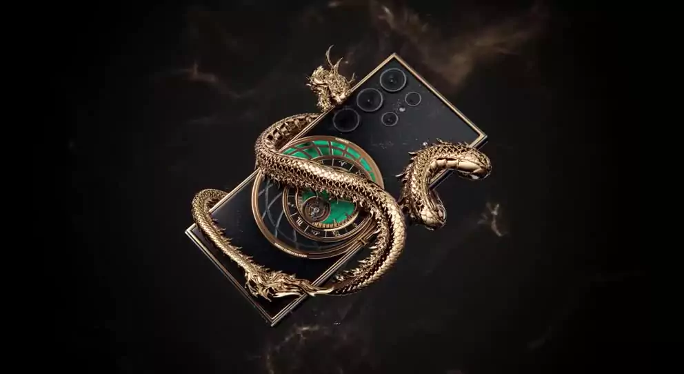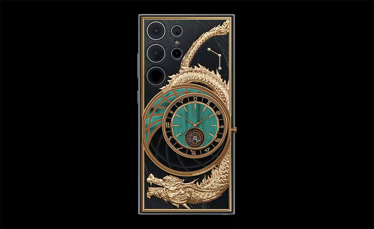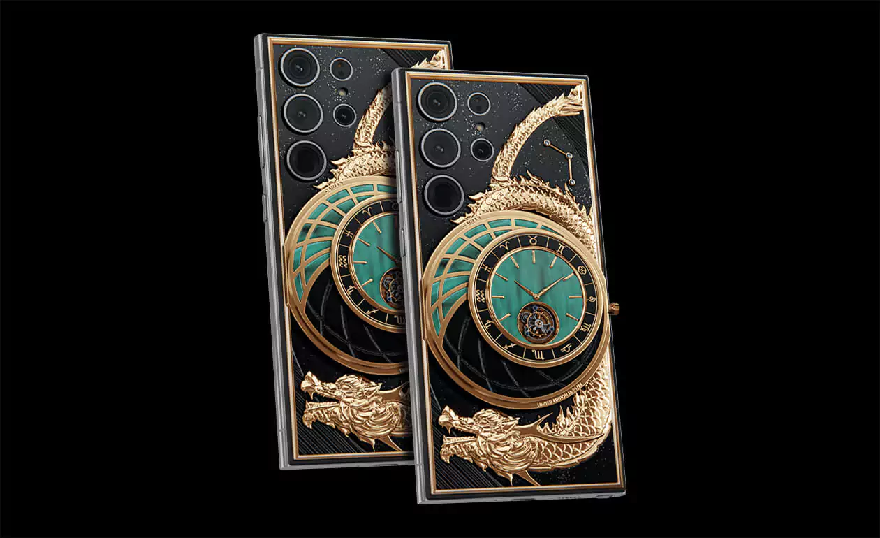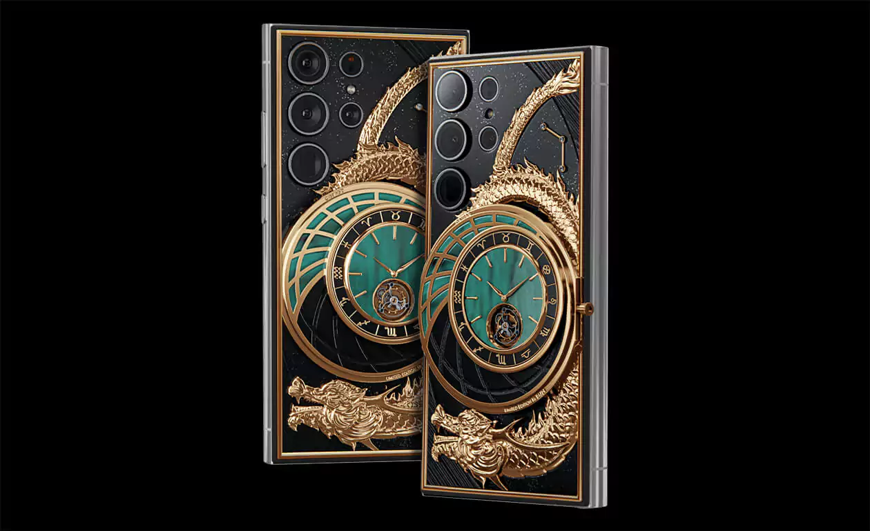 Корейский золотой дракон, три звезды Samsung в виде сияющих бриллиантов, механические часы с турбийоном как воплощение новой эры для компании, а также гравировка звездного неба на титановом полотне. Зеленый цвет циферблата означает возрождение, процветание и наступление нового года. Зодиакальный круг – влияние звезд на успех и господство Samsung в мире технологий.