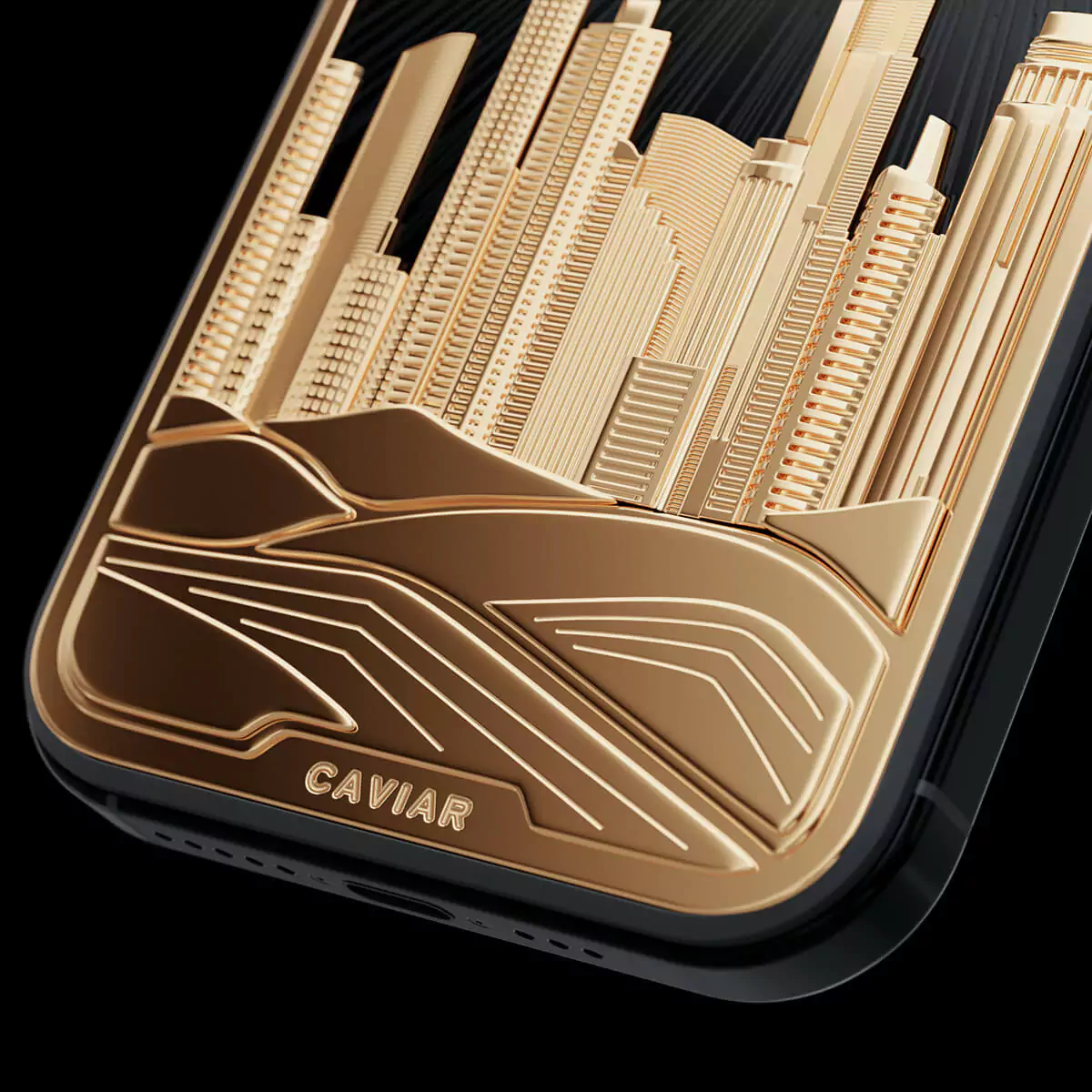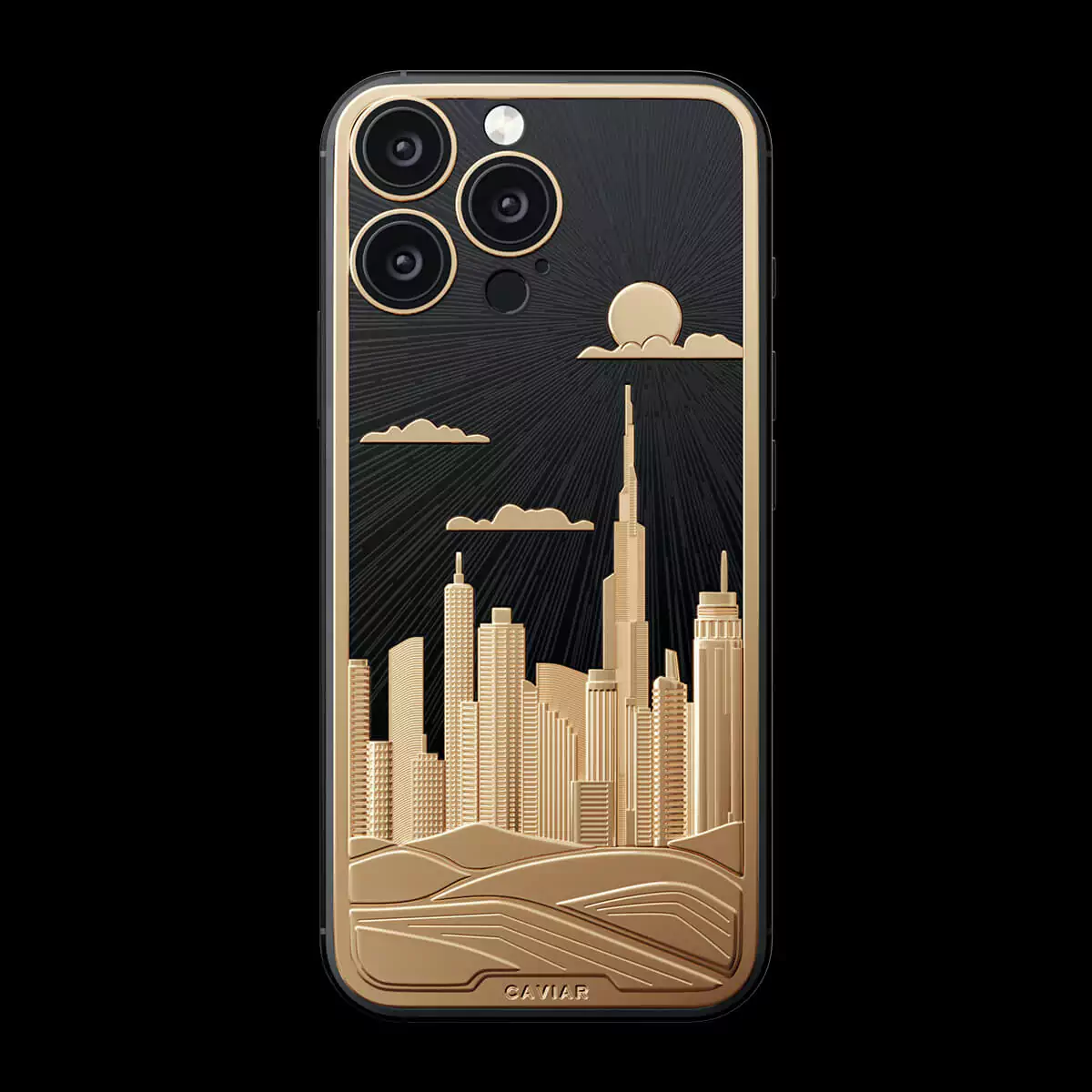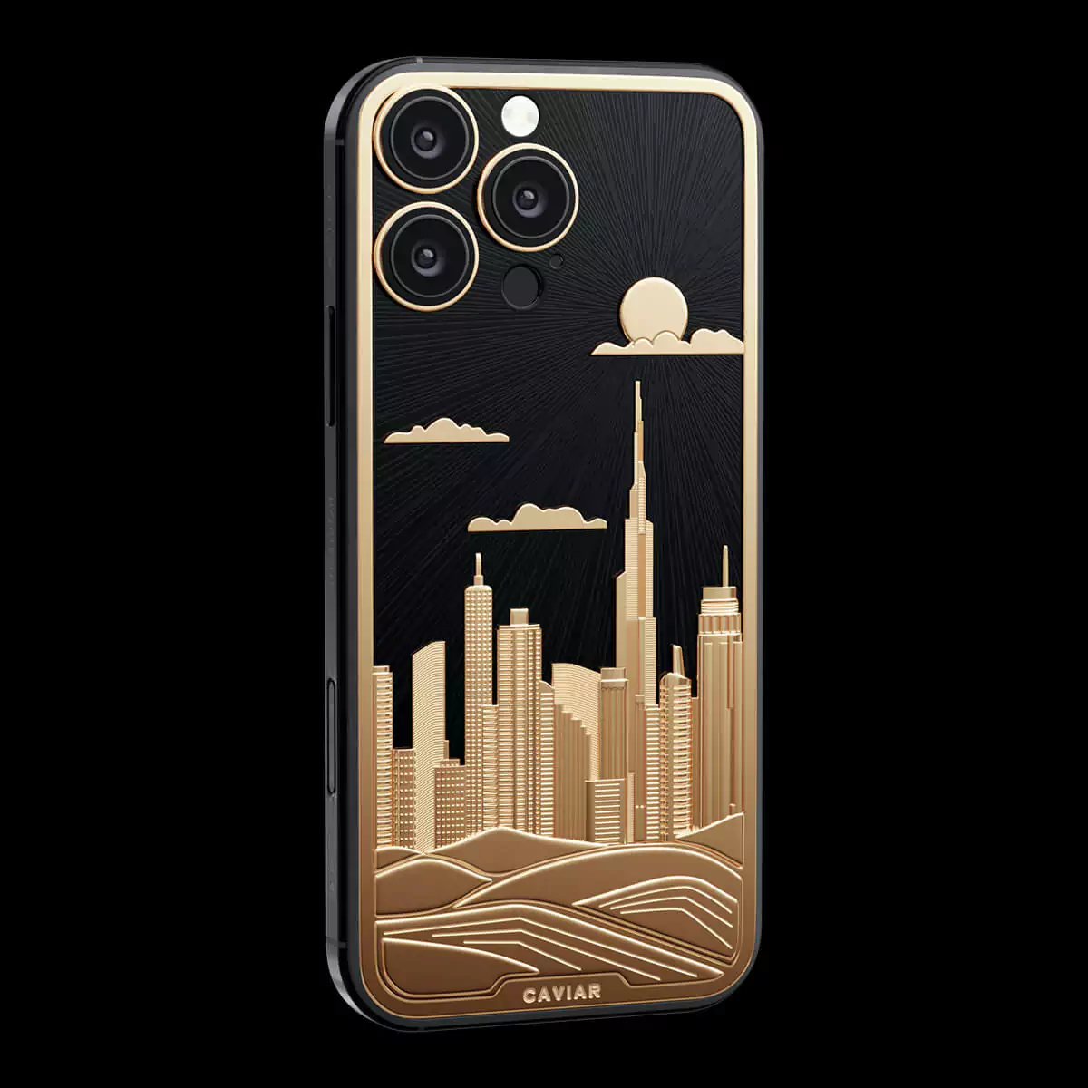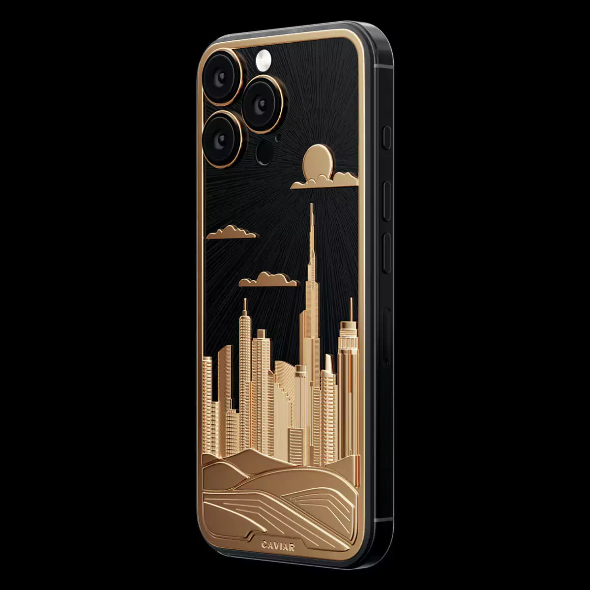Caviar запечатлел величие ближневосточного чуда на корпусе iPhone: роскошная объемная панорама, покрытая 24-каратным золотом, включает силуэты Бурдж-Халифа, Бурдж-аль-Араб и Палм-Джумейры – символов эксклюзивности и грандиозности. Гравировка передает игру света и тени, создавая эффект глубины и движения.