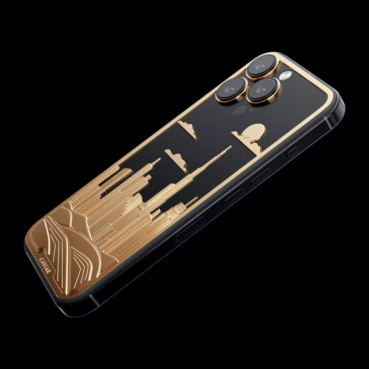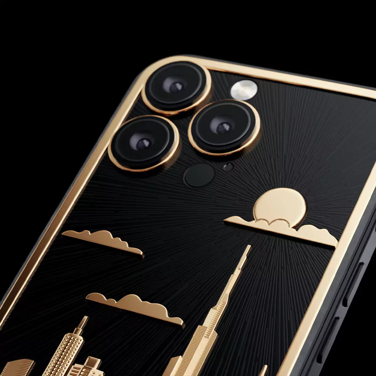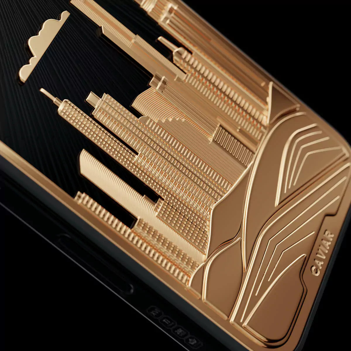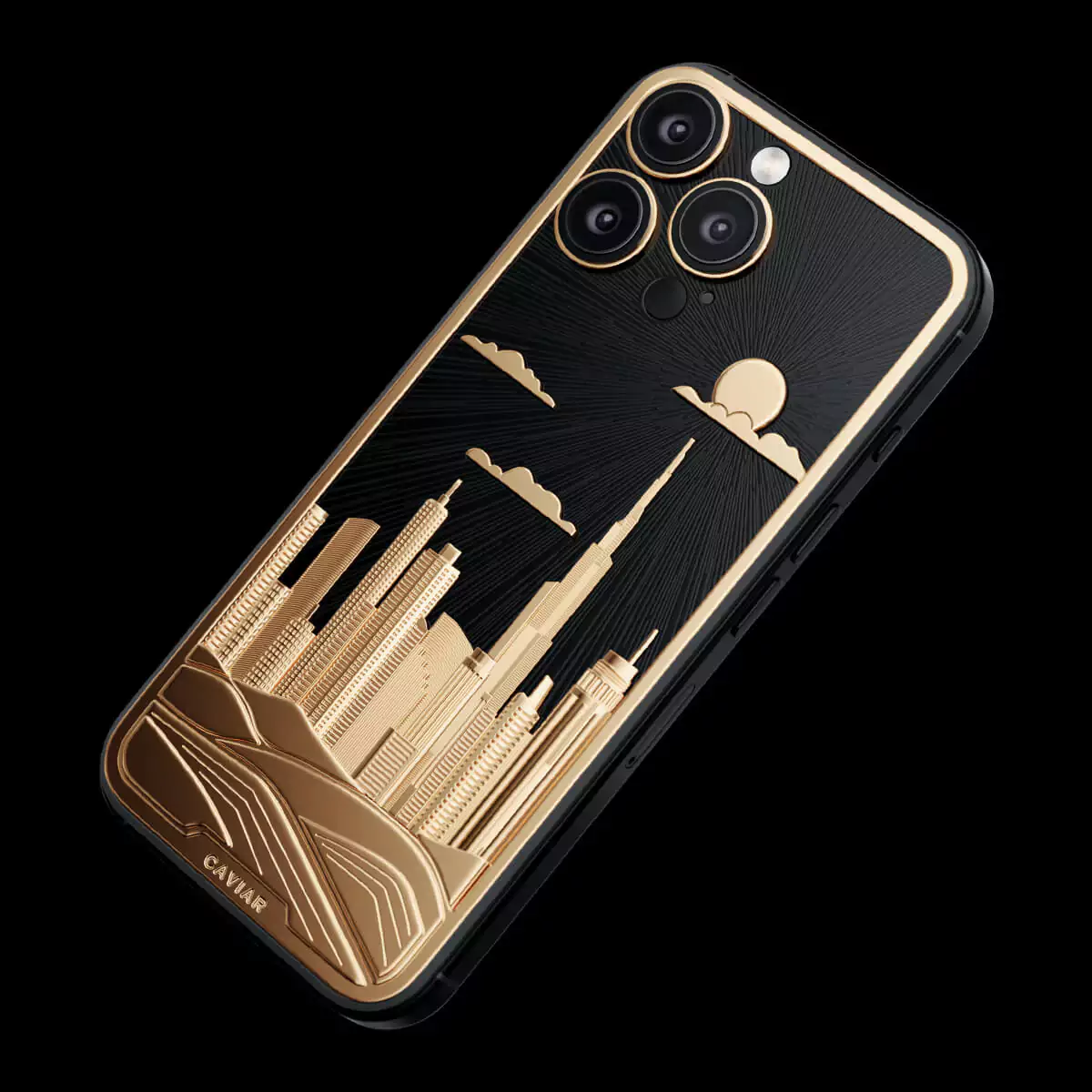 Caviar запечатлел величие ближневосточного чуда на корпусе iPhone: роскошная объемная панорама, покрытая 24-каратным золотом, включает силуэты Бурдж-Халифа, Бурдж-аль-Араб и Палм-Джумейры – символов эксклюзивности и грандиозности. Гравировка передает игру света и тени, создавая эффект глубины и движения.