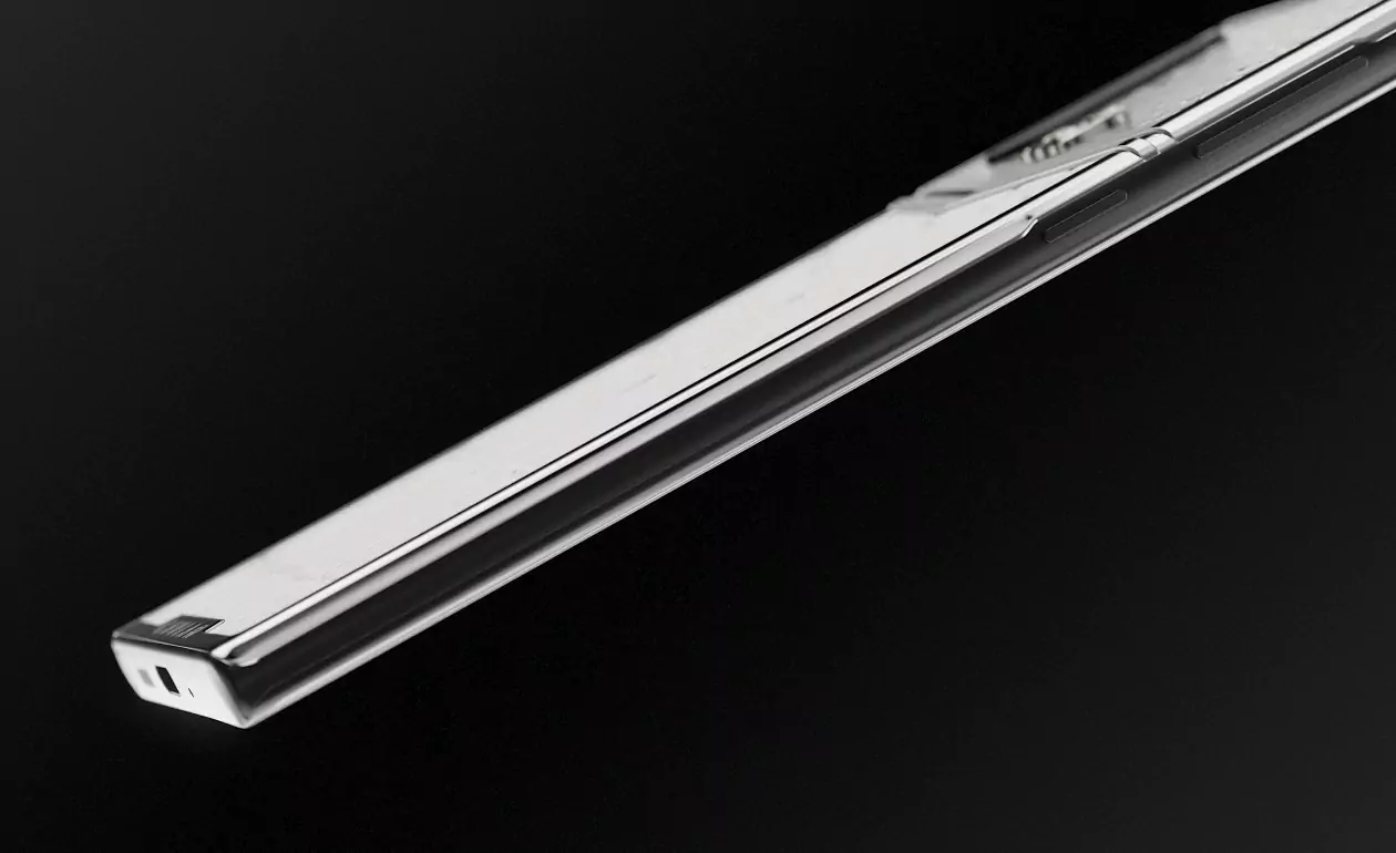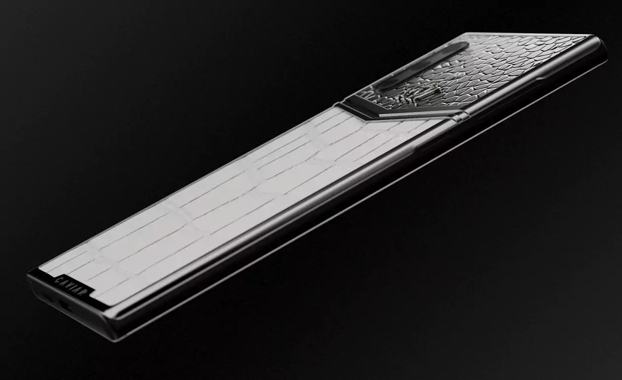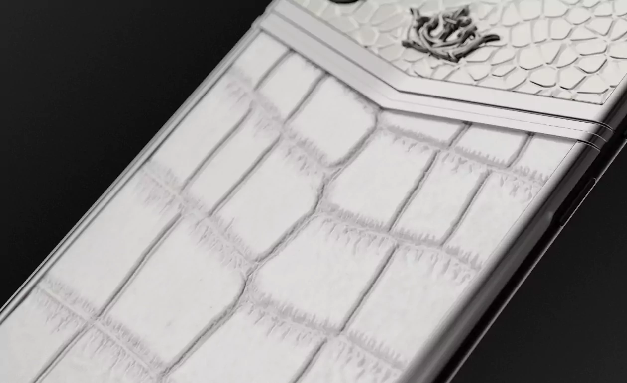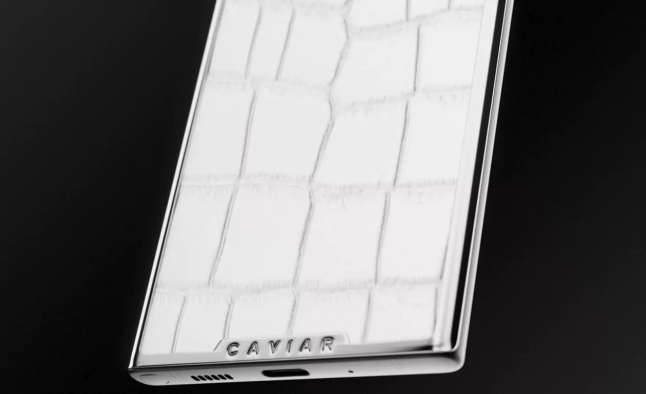 For this model, Caviar designers selected only luxurious materials in the purest white color. Its body, decorated with V-shaped brand silver “tick” is divided by it into two parts. The upper one is made of silver with a handmade relief pattern. The lower one is made of natural white alligator leather of fine embossing.