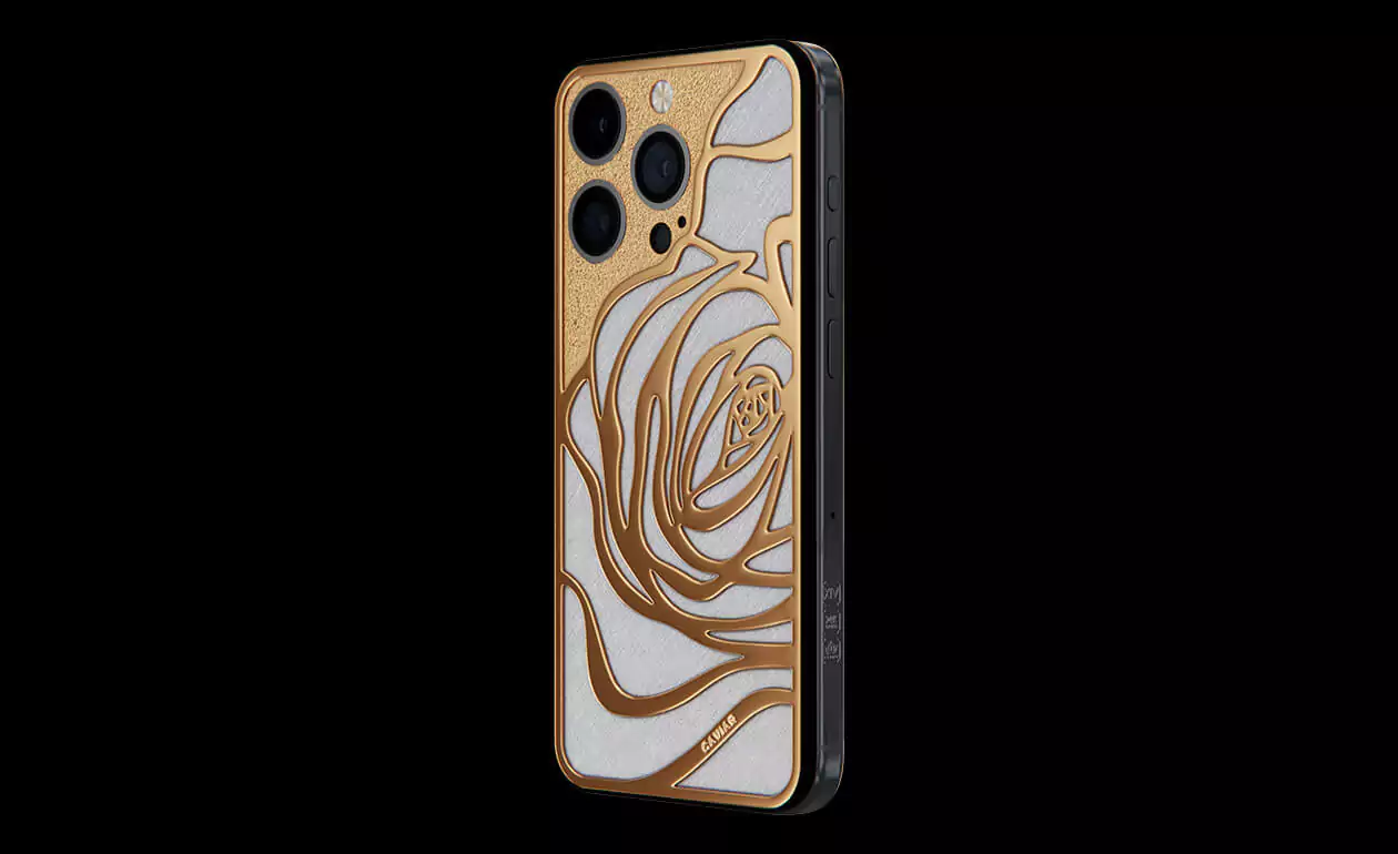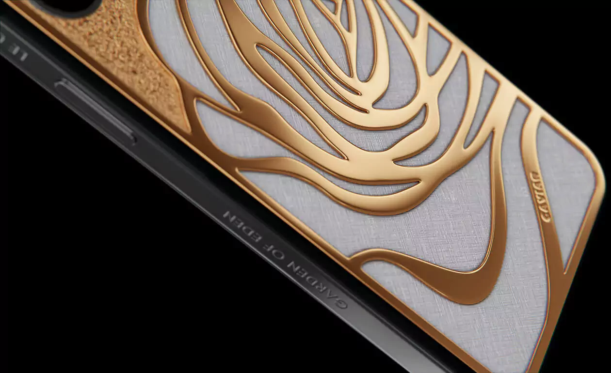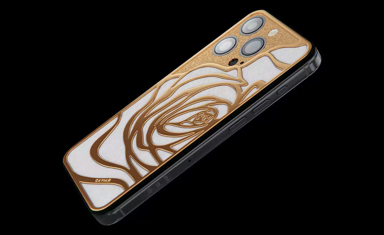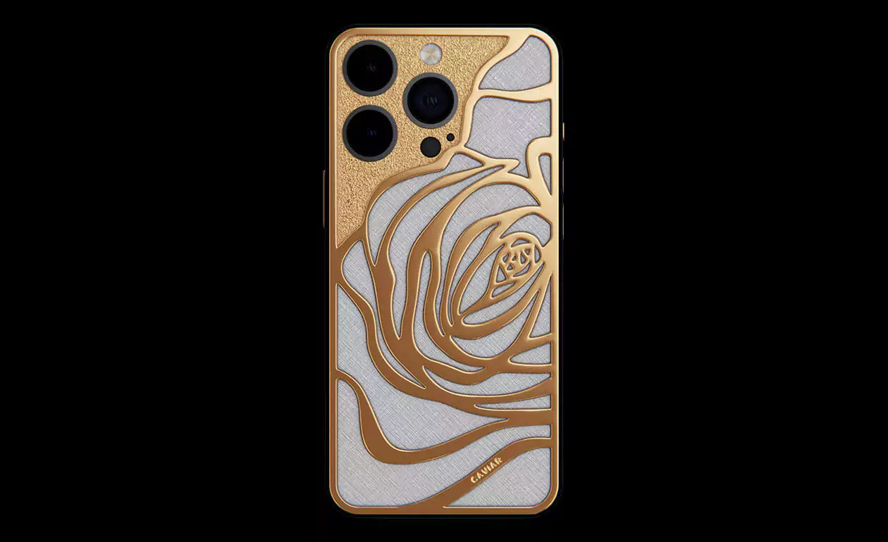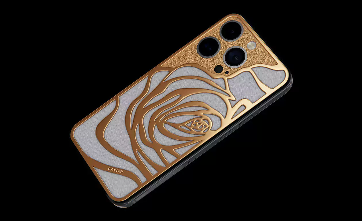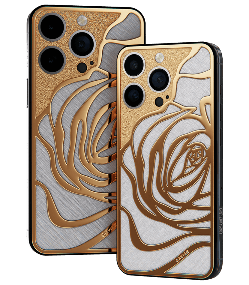 Golden Rose от Caviar воплощает собой искреннее признание в любви. Наша сияющая роза создана из ювелирного сплава, покрытого двойным слоем 24-х каратного золота, и белой телячьей кожи. В основе телефона лежит золотая версия iPhone 15 Pro.