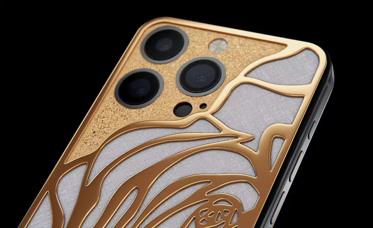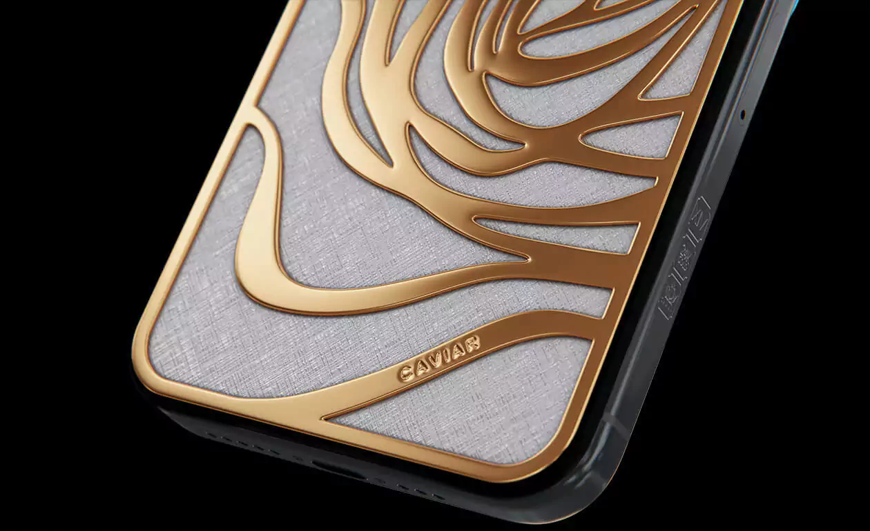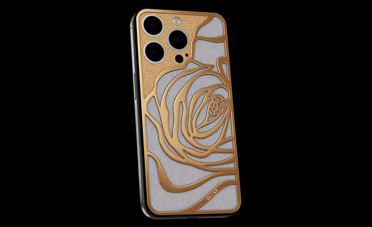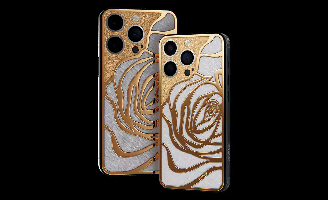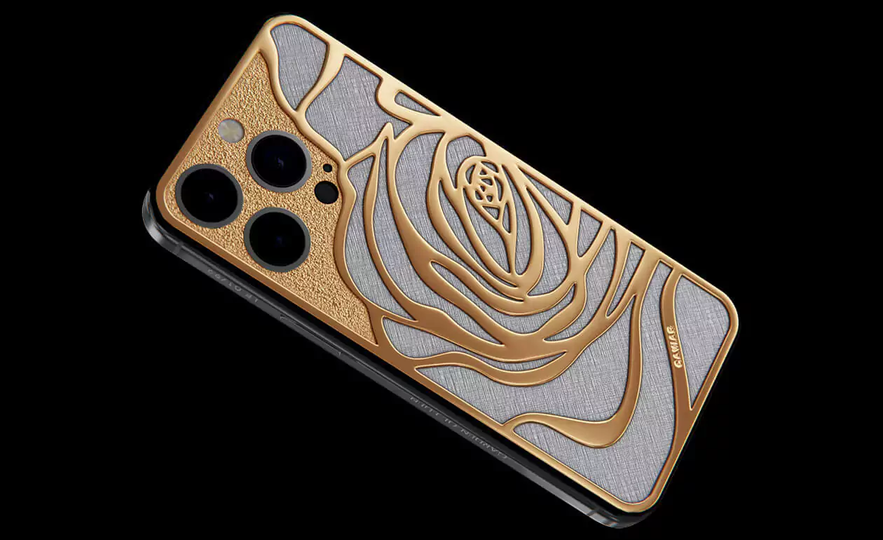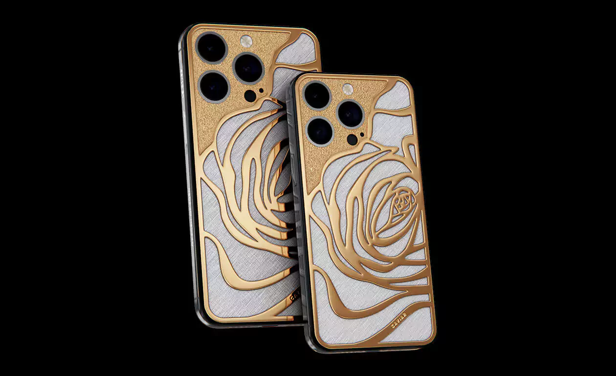 Golden Rose от Caviar воплощает собой искреннее признание в любви. Наша сияющая роза создана из ювелирного сплава, покрытого двойным слоем 24-х каратного золота, и белой телячьей кожи. В основе телефона лежит золотая версия iPhone 15 Pro.