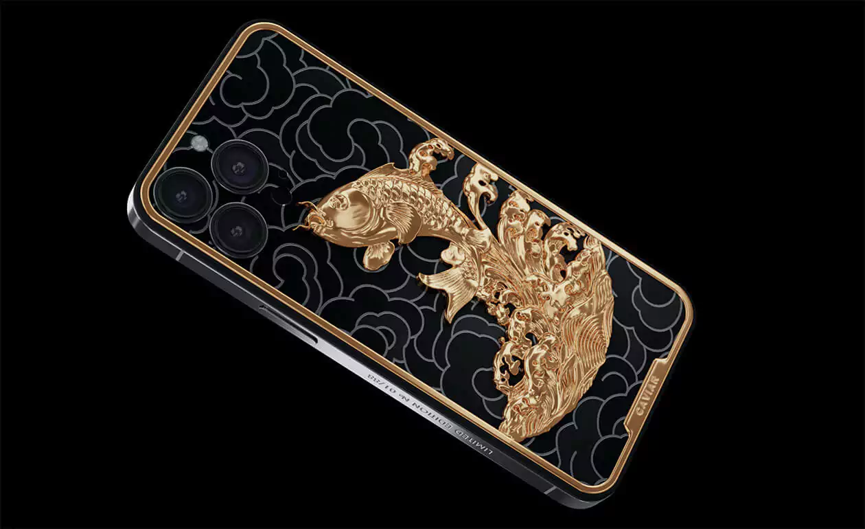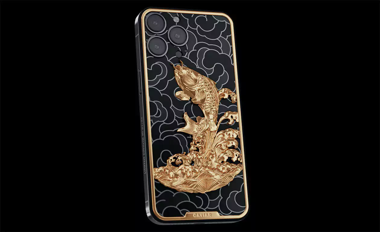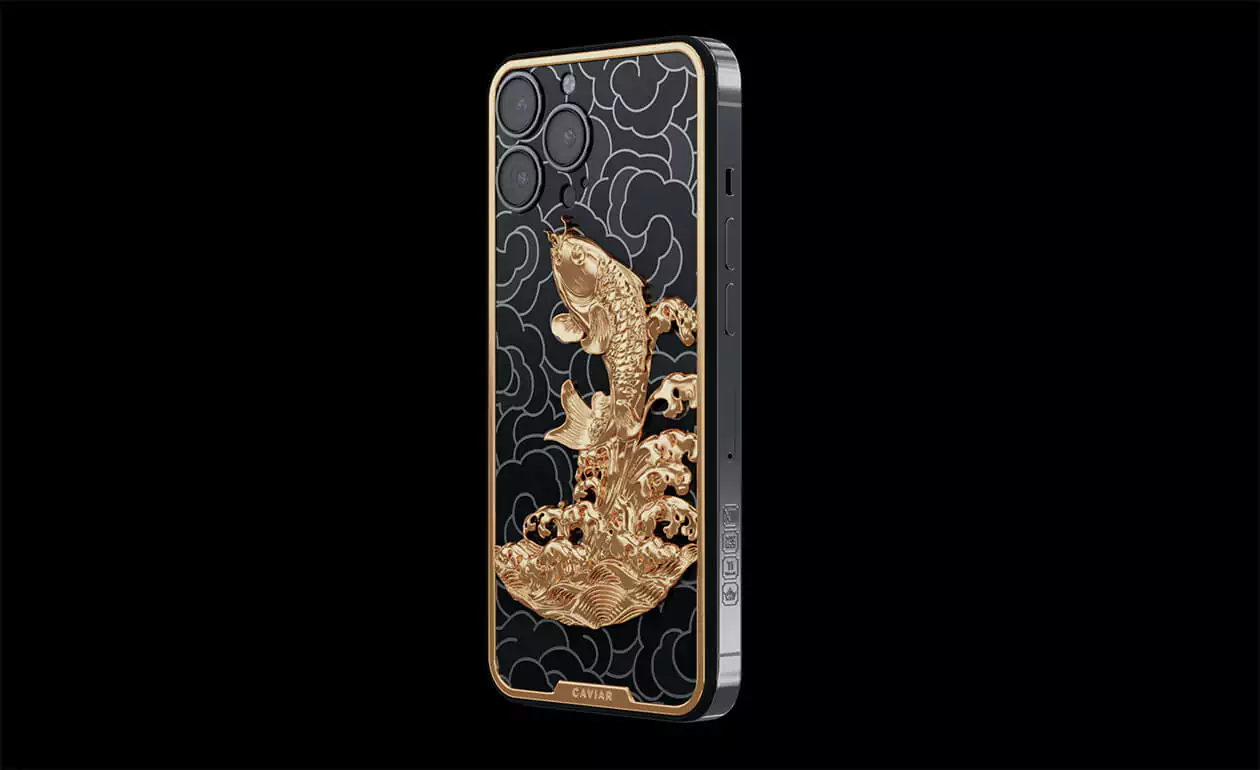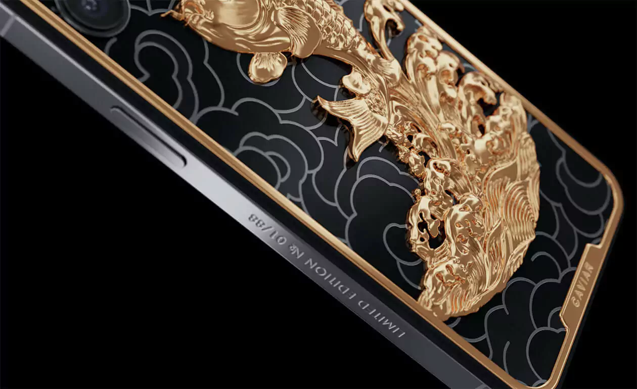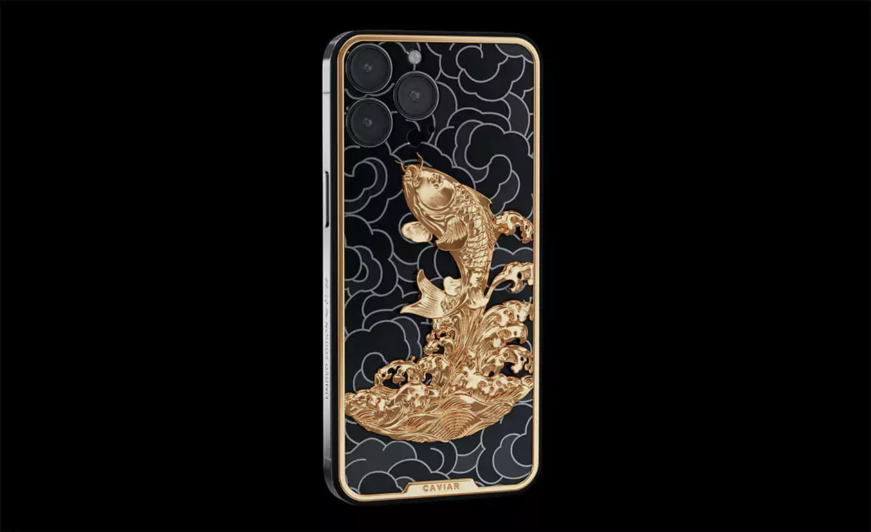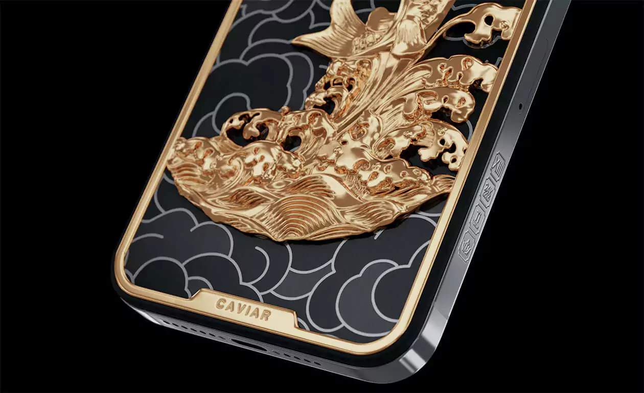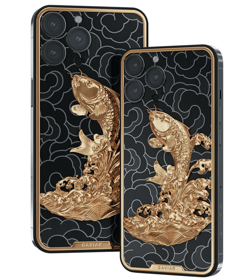 На черных титановых волнах корпуса этой яркой модели плещется золотой карп, изготовленный из ювелирного сплава, покрытого золотом 24К. Завершает образ элегантная золоченая рамка, украшенная логотипом Caviar.