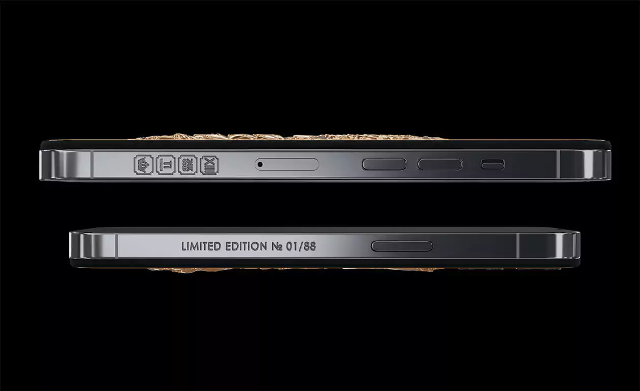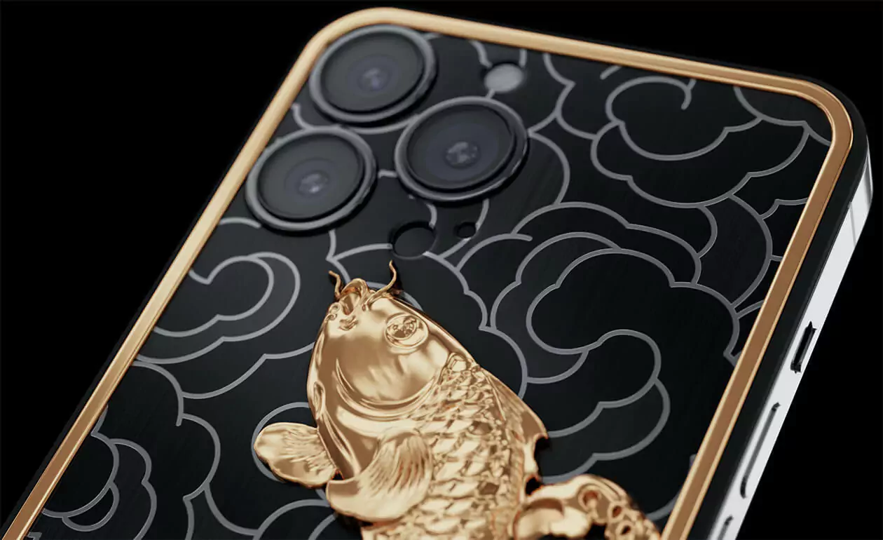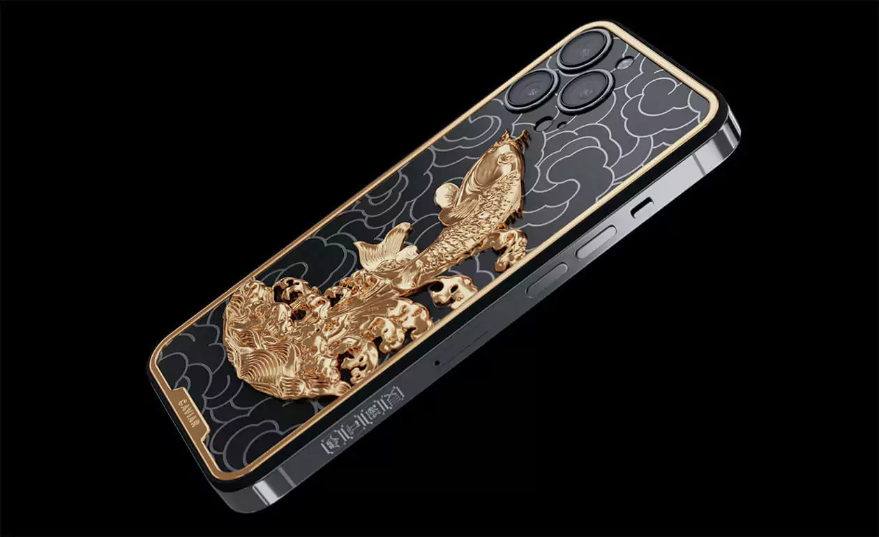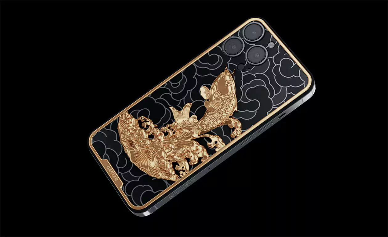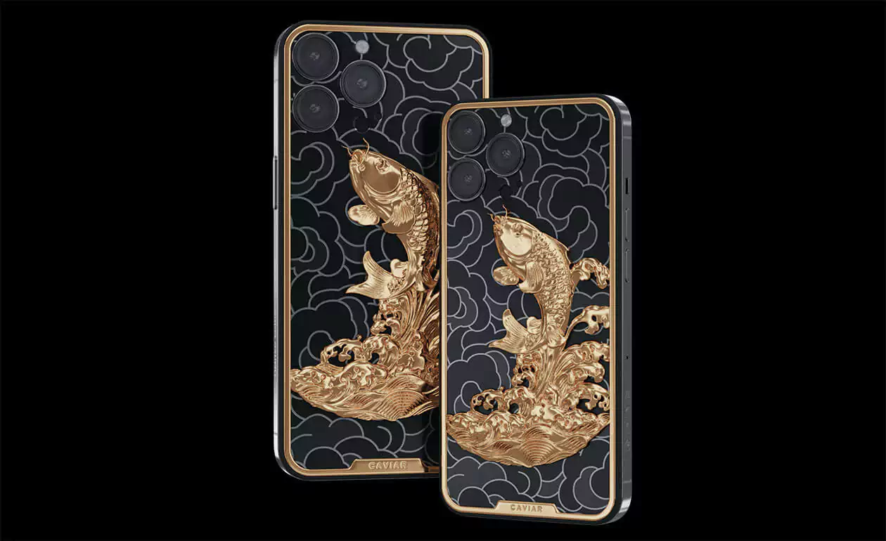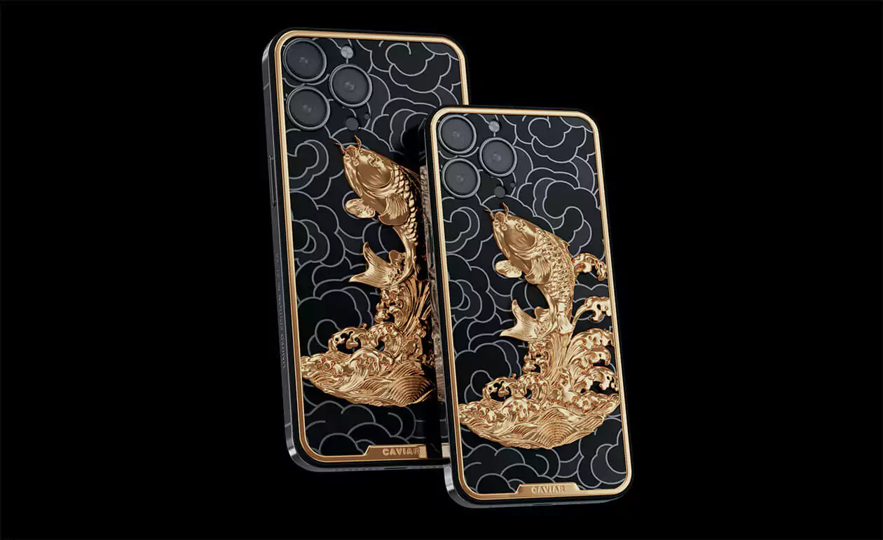 На черных титановых волнах корпуса этой яркой модели плещется золотой карп, изготовленный из ювелирного сплава, покрытого золотом 24К. Завершает образ элегантная золоченая рамка, украшенная логотипом Caviar.