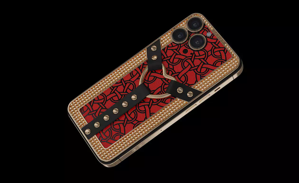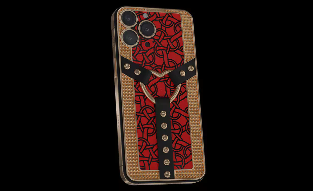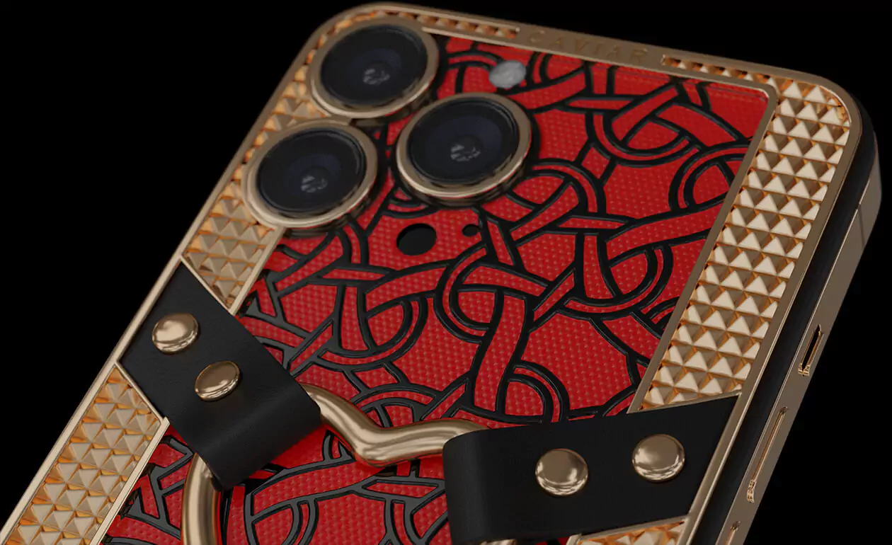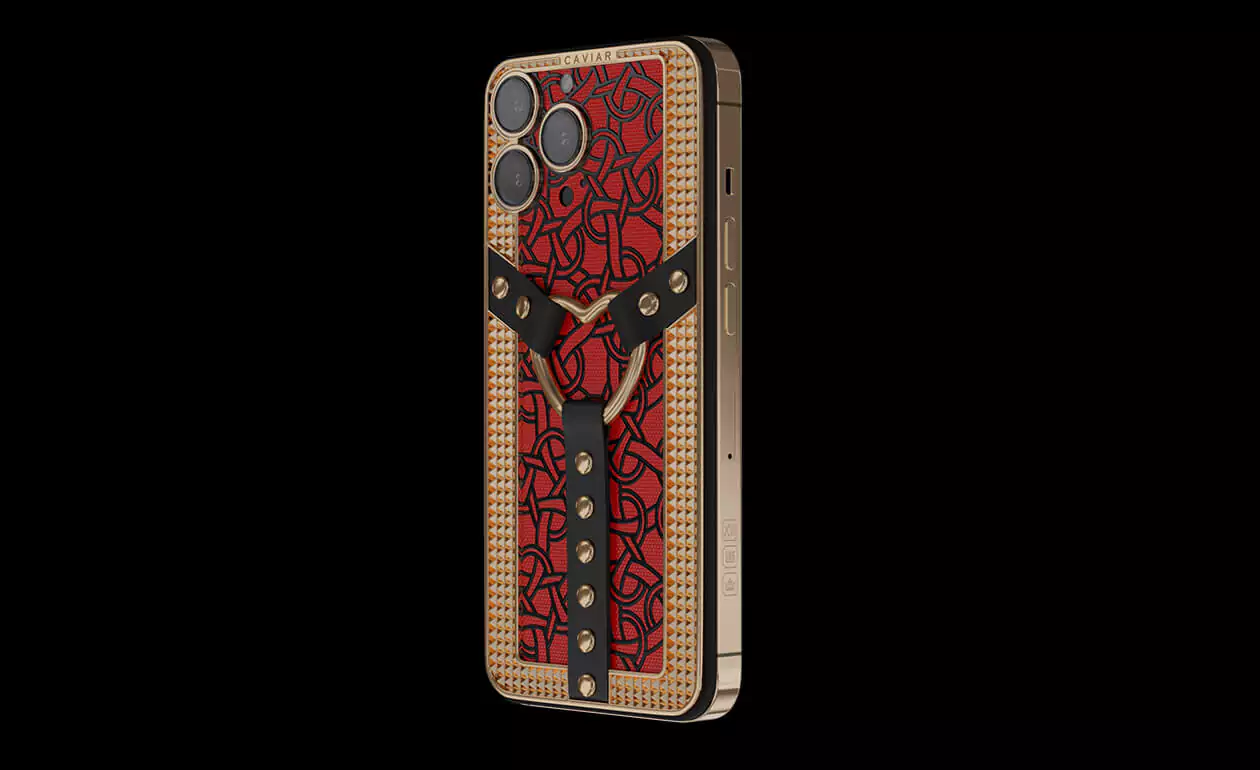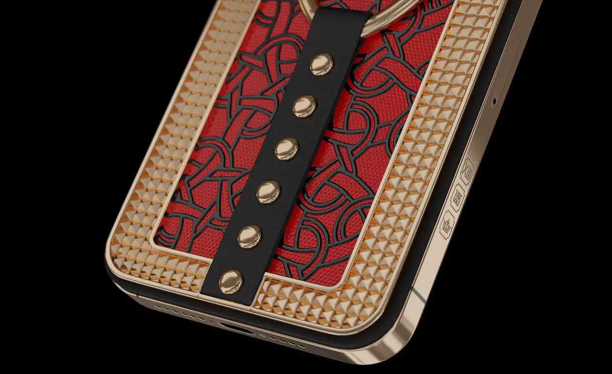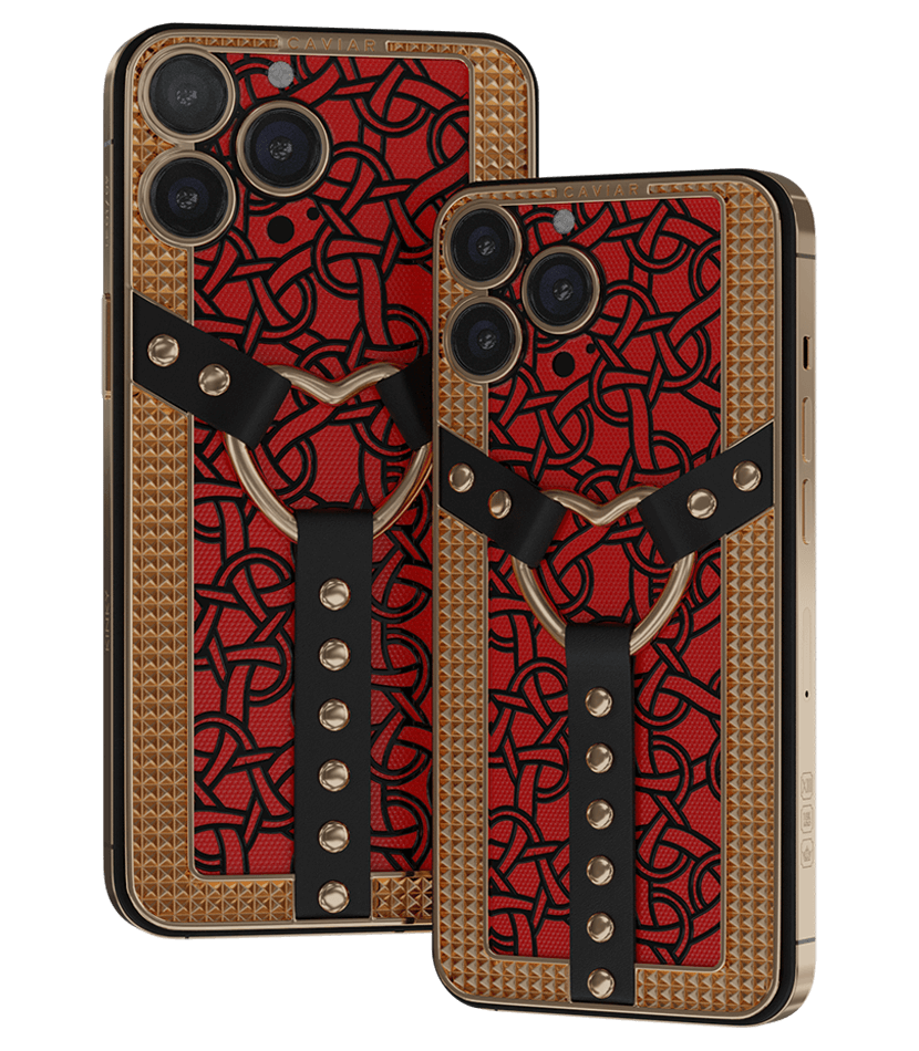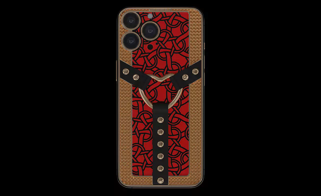 Тонкие кожаные ремешки надежно удерживают объемное сердце из 18-каратного золота на задней панели этого интригующего воображение iPhone 13 Pro от Caviar, а ярко-красное панно с кружевной гравировкой придает образу еще больше пикантности.