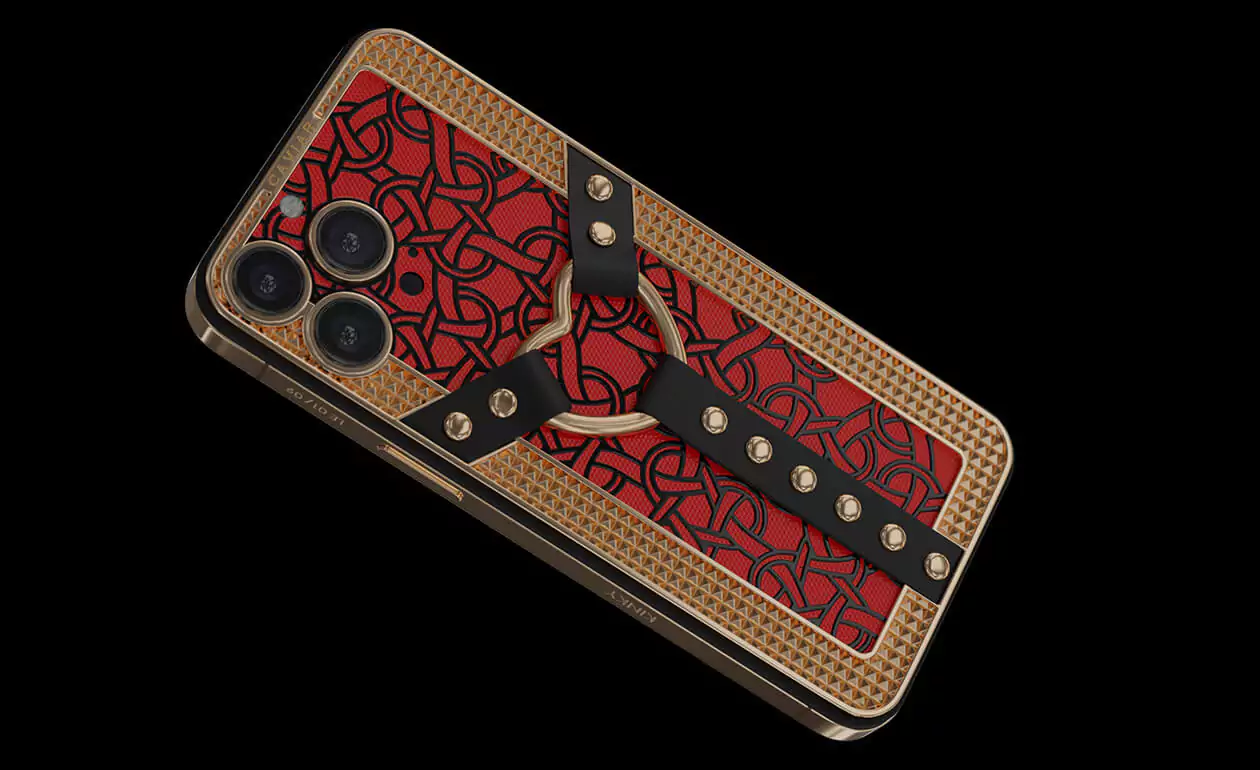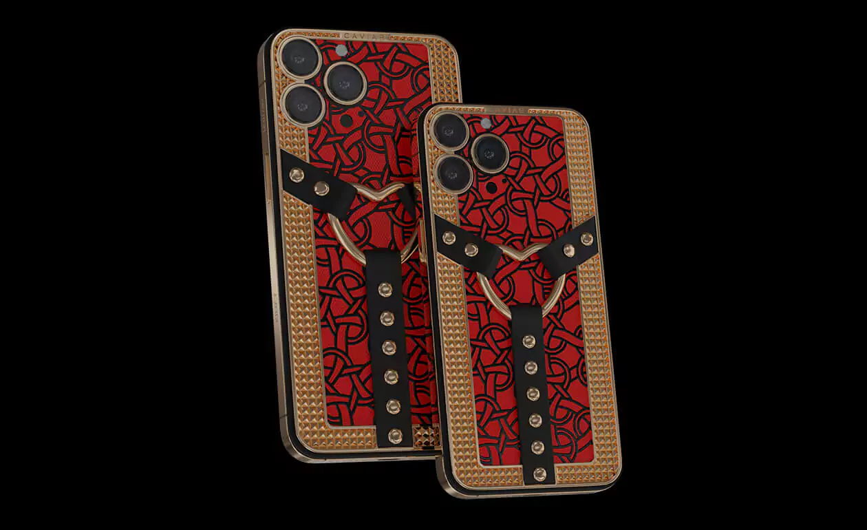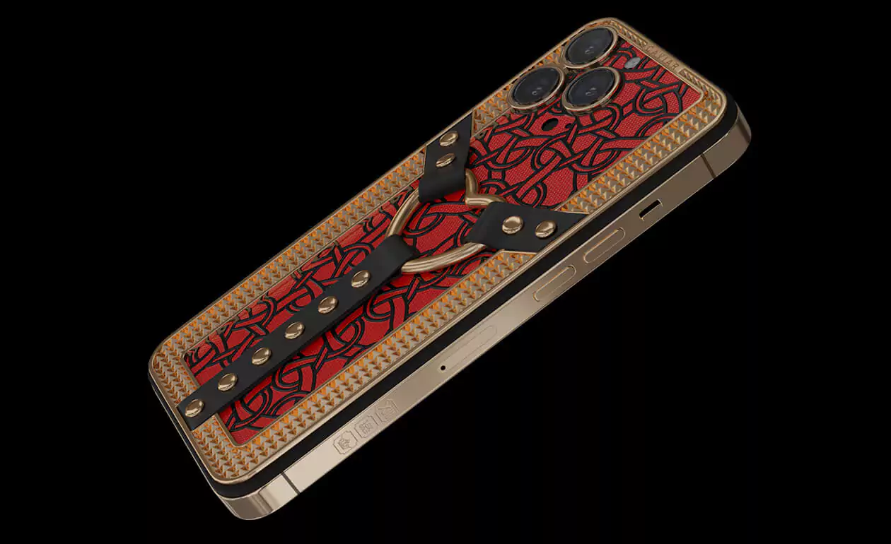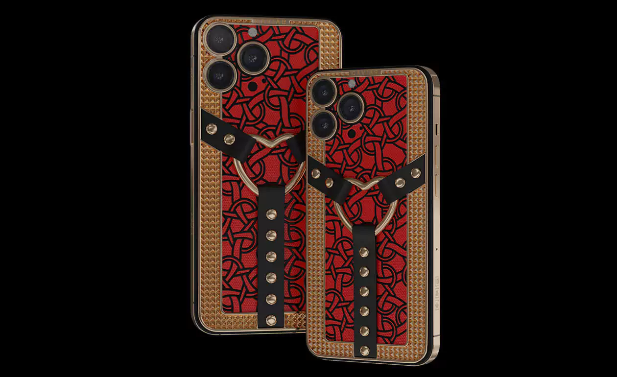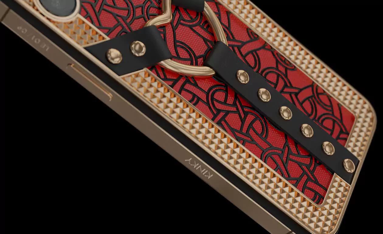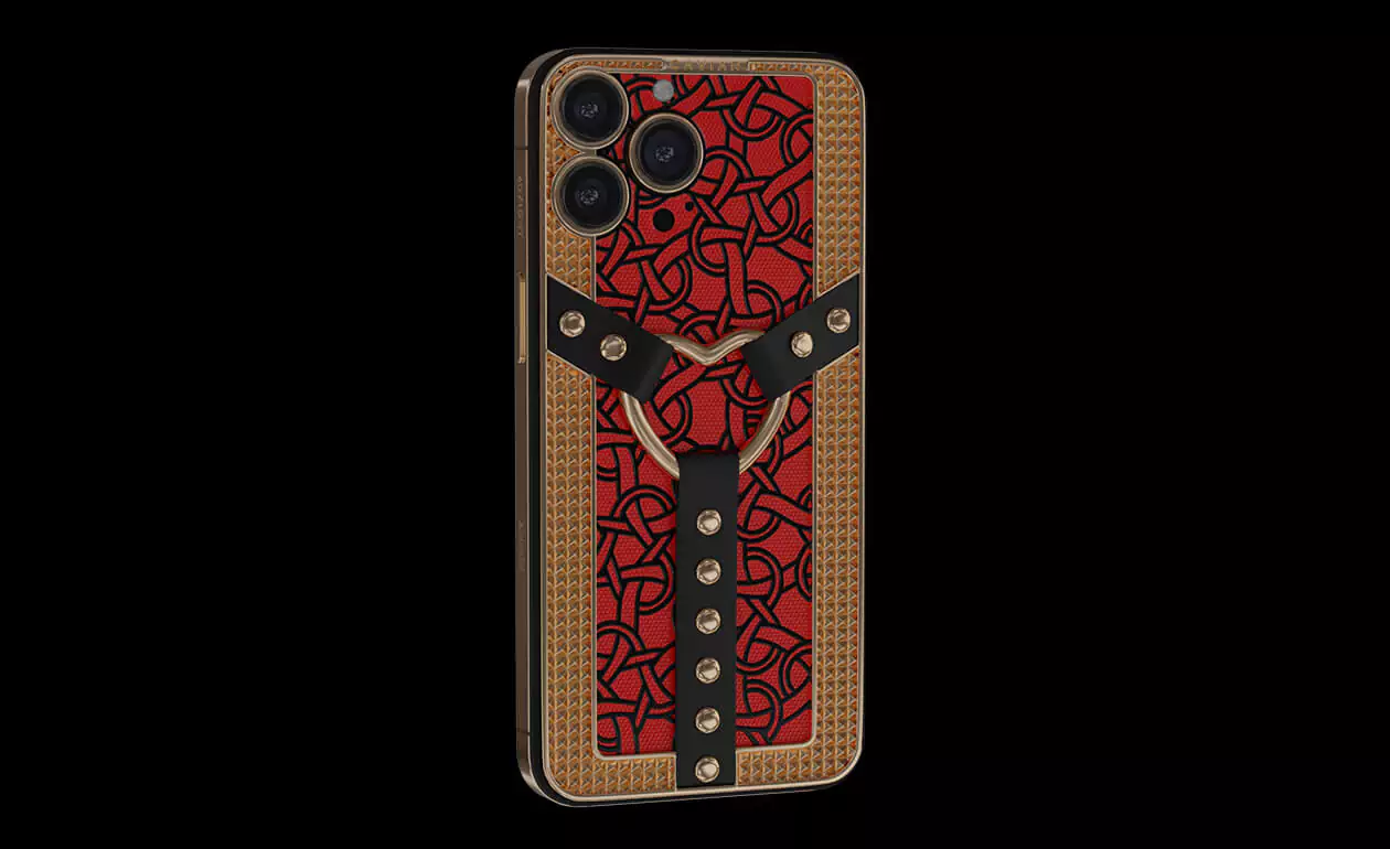 Тонкие кожаные ремешки надежно удерживают объемное сердце из 18-каратного золота на задней панели этого интригующего воображение iPhone 13 Pro от Caviar, а ярко-красное панно с кружевной гравировкой придает образу еще больше пикантности.
