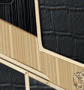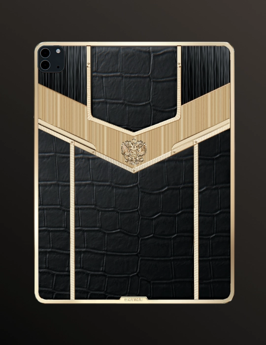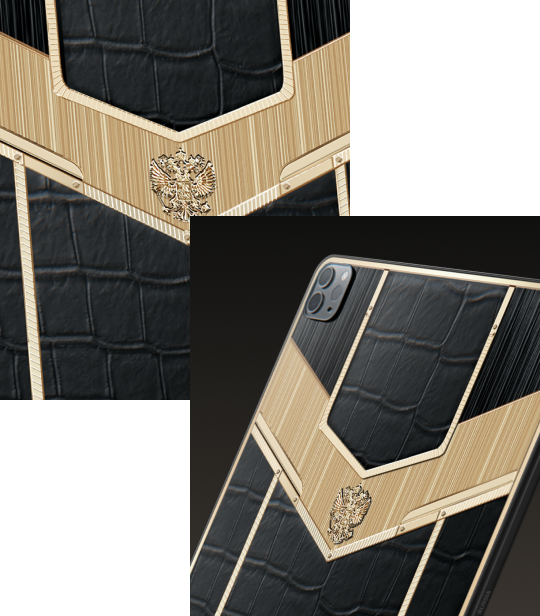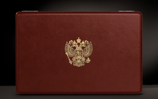 Корпус устройства обтянут натуральной кожей и украшен Российским Орлом, покрытым золотом 999 пробы. Герб инкрустирован вставками из черного оникса - эксклюзивного камня, из которого сделаны личные наручные часы Президента В.В. Путина.