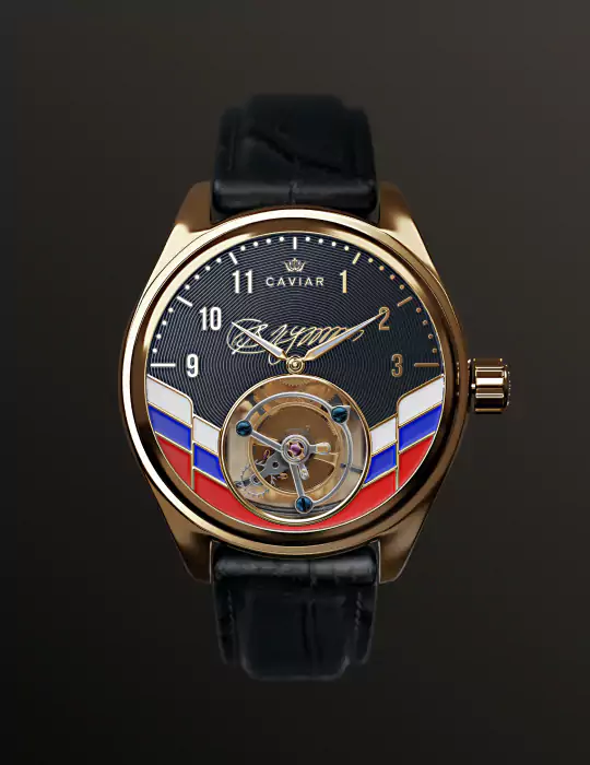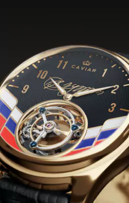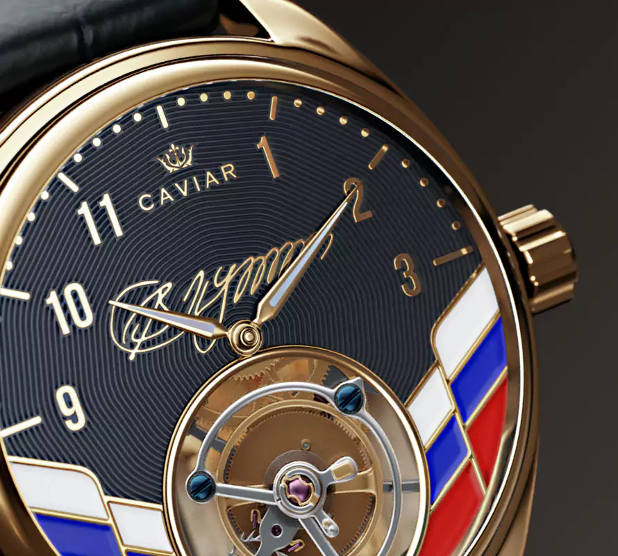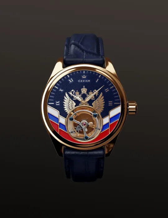 Циферблат украшен ювелирной эмалью в цветах флага России — белого, синего и красного — как отражение истории, силы и единства страны.