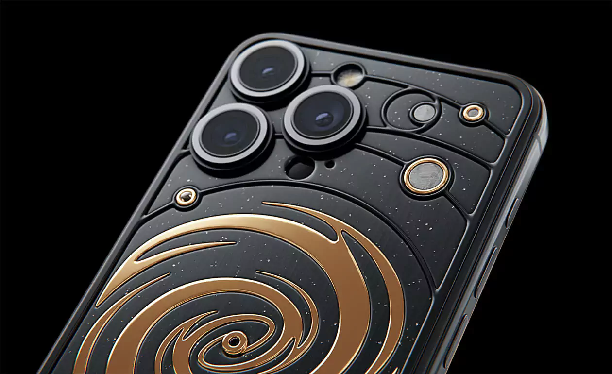 The power of revolving Universe on your phone. Caviar masters incrusted the phone with tiny pieces of ancient meteorites. One of them is Muonionalusta, the most ancient cosmic visitor aged at 4,5 billion years. The gold-plated spiral embodies our galaxy. Are we alone here? Think about it holding iPhone 15 Pro Astral in your hands.