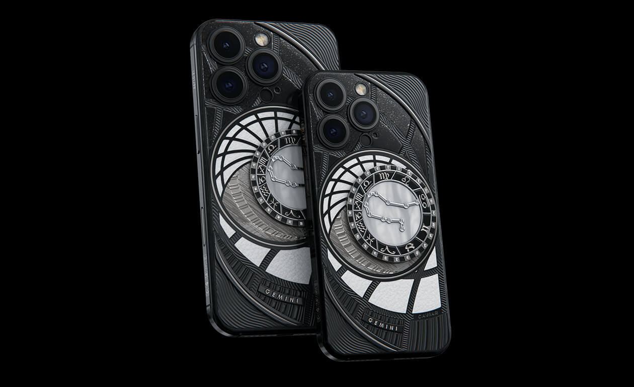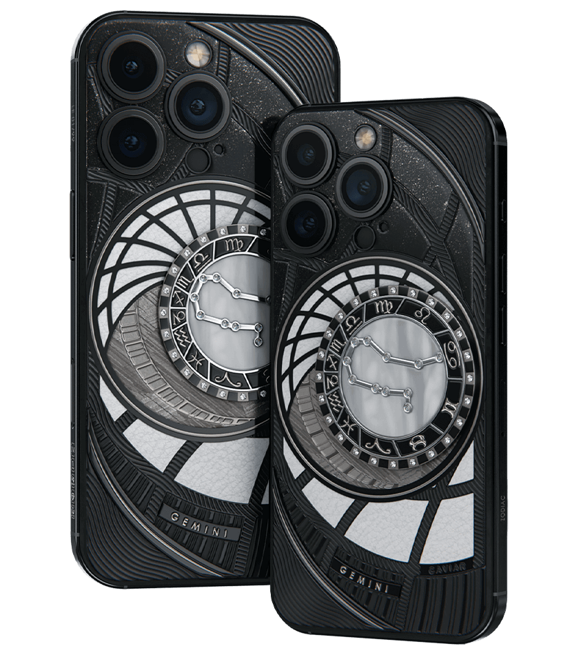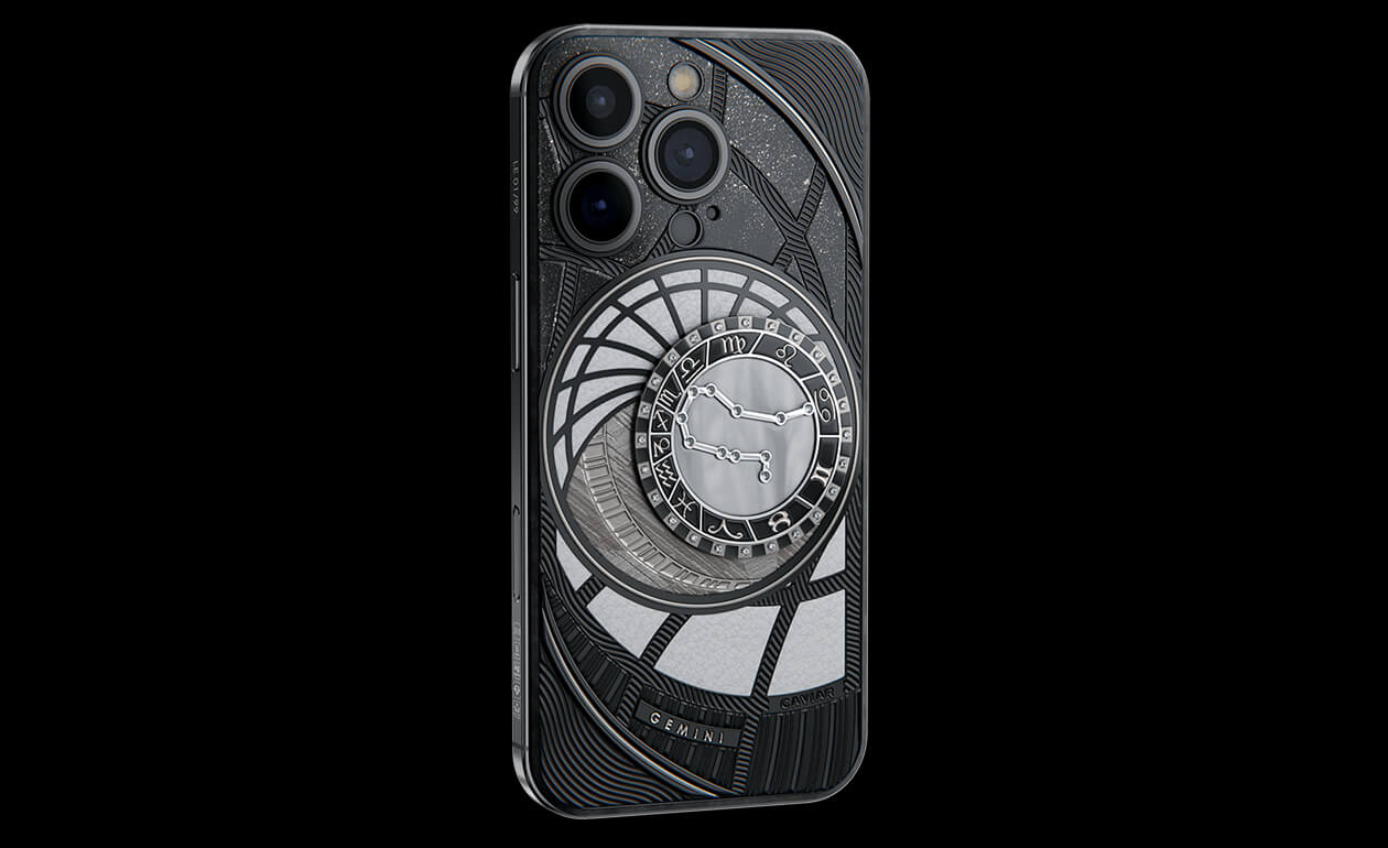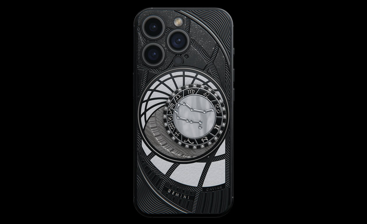 Близнецы, сегодня мы представляем вам. На корпусе смартфона есть небесный свод с вашими звездами. Это панно из 24 кристаллов Swarovski, созданное на черном титане с PVD-покрытием. Мы подчеркнули сияние кристальной россыпи с помощью с помощью белого композита и завершили композицию фрагментом метеорита на телячьей коже белоснежного цвета.