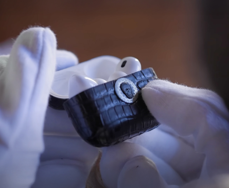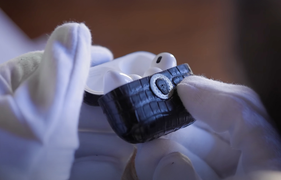- AirPods в корпусе из натуральной кожи аллигатора с гангстерским акцентом — черепной вставкой из ювелирного сплава.