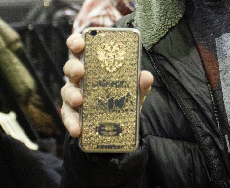 - iPhone с российской символикой — покрытый золотом смартфон с изображением двуглавого орла, щита и узоров в духе имперской эстетики.
