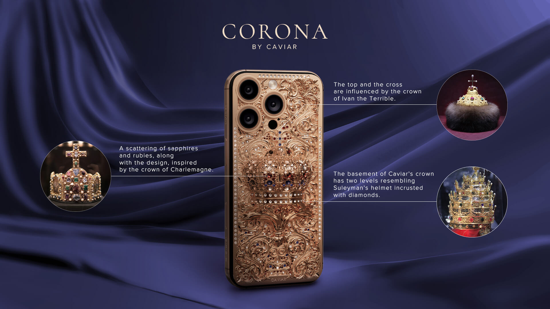 Верхняя часть короны Caviar украшена крестом и напоминает шапку русского царя, основная часть инкрустирована драгоценными камнями, цветовое сочетание которых было вдохновлено короной Священной Римской Империи. Композицию из камней дополняют растительные узоры, вдохновленные восточной эстетикой. Нижняя часть короны повторяет форму шлема Сулеймана Великолепного.