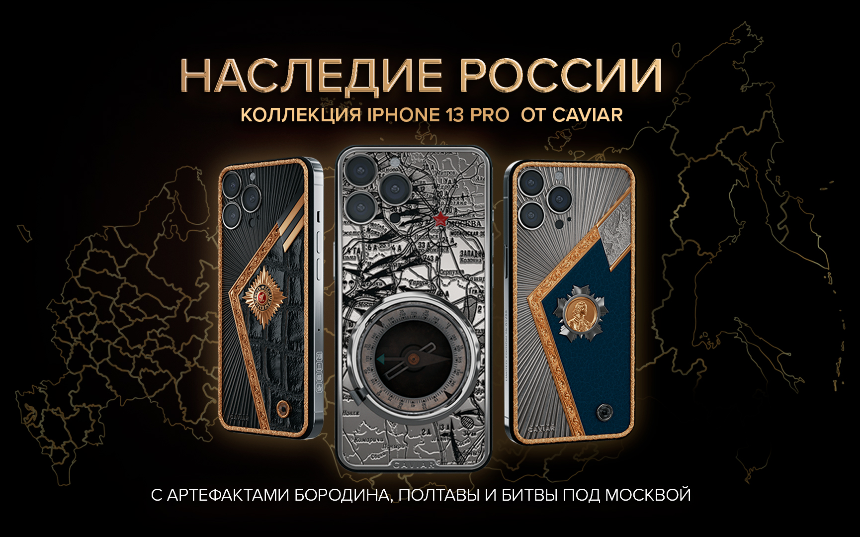 Российский бренд люксовых смартфонов и аксессуаров Caviar в канун Дня народного единства презентует коллекционные дизайны iPhone 13 Pro, инкрустированные настоящим компасом времен Битвы под Москвой 1941, пулями Северной войны и штыком 1812 года.