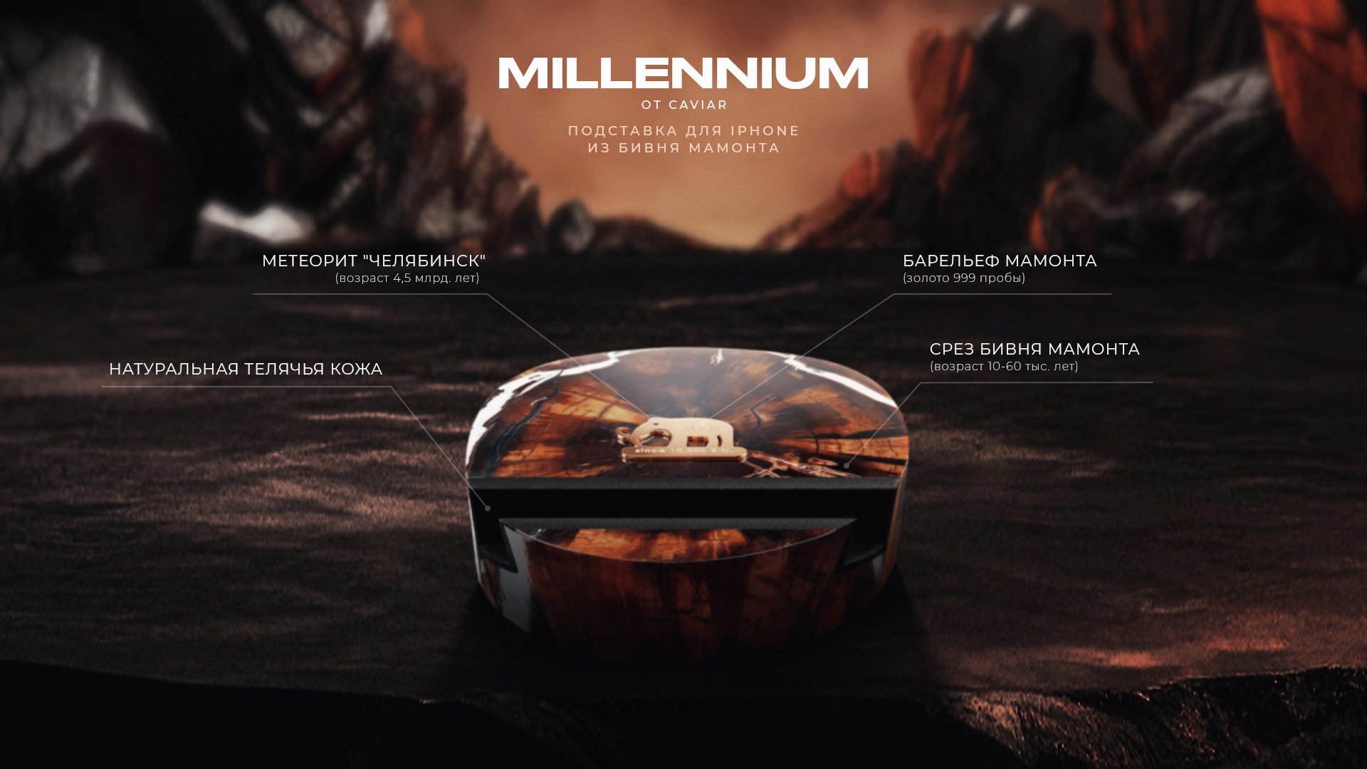 «Россия – необыкновенная страна. Вы знали, что в Якутии было найдено 80% всех известных останков этих могучих животных? В Caviar мы часто используем редкие, уникальные материалы, поэтому подставку под телефон создали из настоящего бивня мамонта возрастом более 10 000 лет и украсили вставкой из Челябинского метеорита» – Сергей Владимирович Китов, генеральный директор Caviar.
