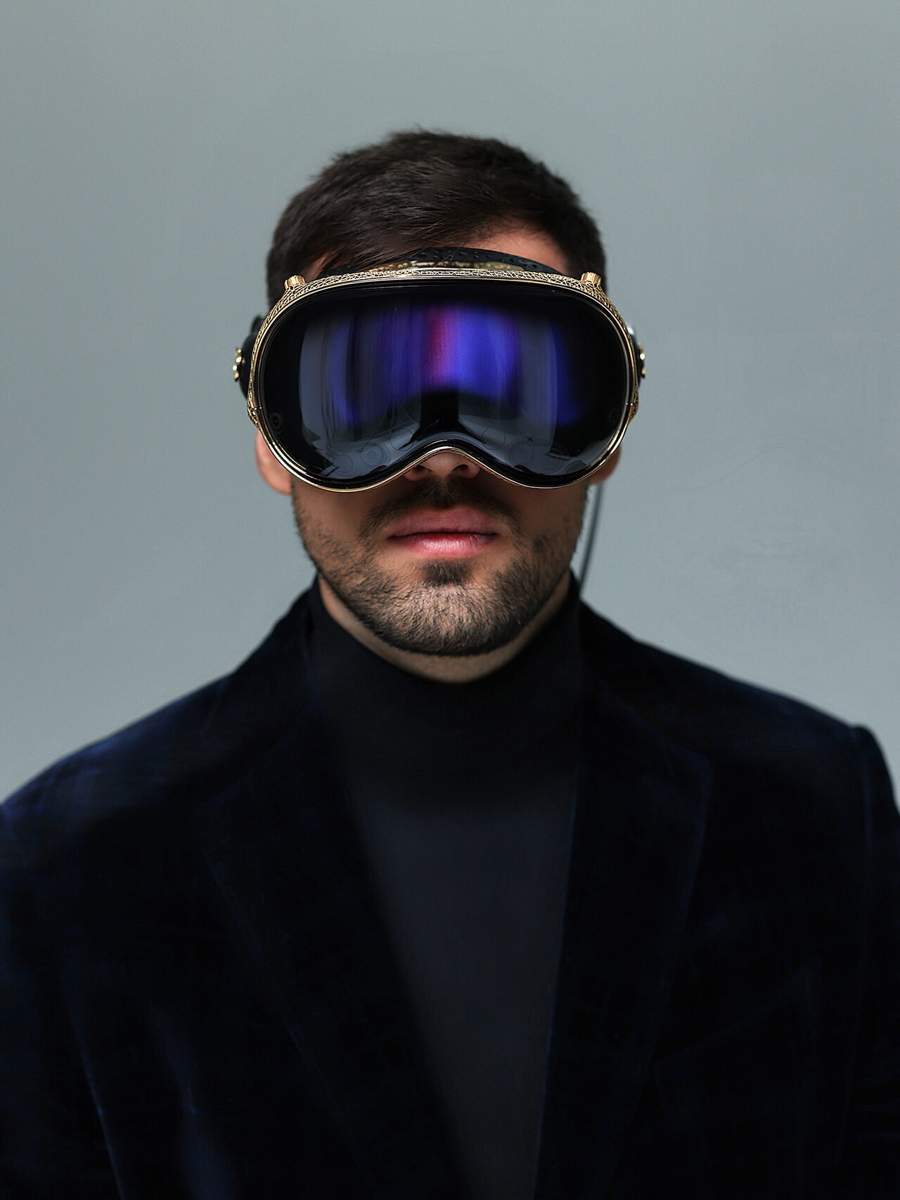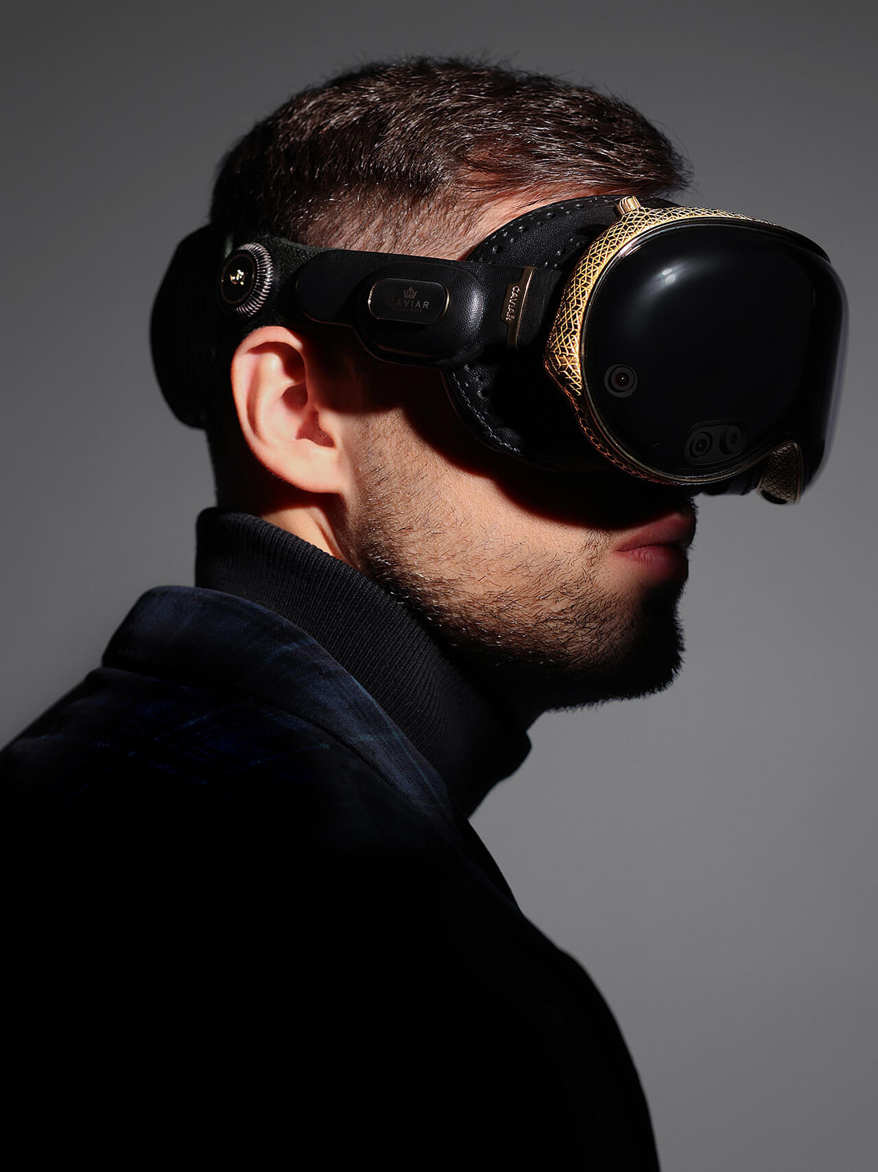 Световой уплотнитель Light Seal и наушники с 3D-звуком покрыты вручную прошитой кожей, обеспечивая новый тактильный опыт взаимодействия с устройством. Рамка очков покрыта золотом 999 пробы и украшена сложным геометрическим узором. Головная подушка выполнена в строгом черном цвете, добавляя завершенность внешнему виду, а декоративные элементы из черной эмали, серебра и золота придают устройству элегантность. Благодаря этим деталям, внешний вид очков производит неизгладимое впечатление.