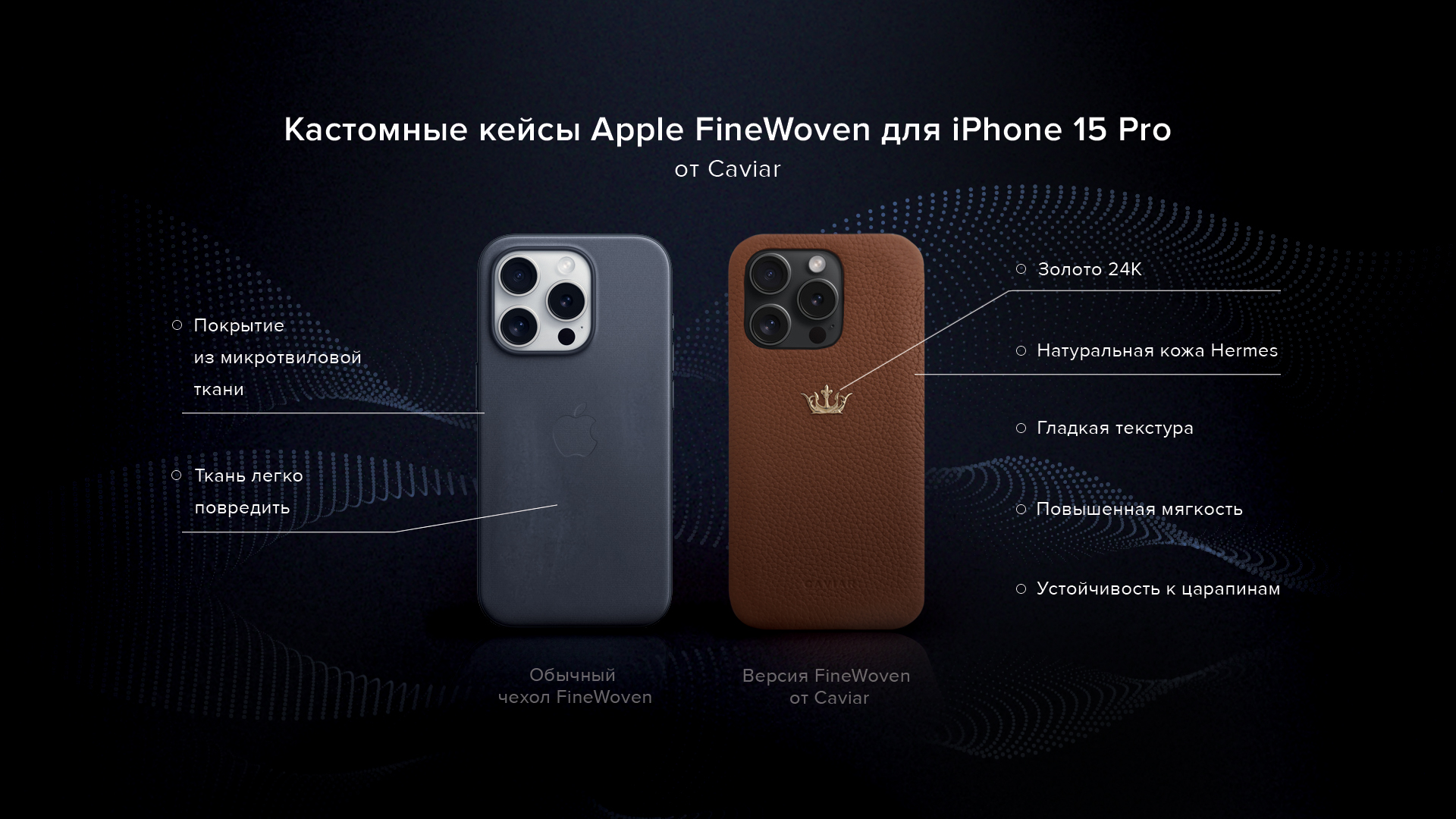 Основатель компании Caviar, Сергей Китов, отмечает: "Не все были довольны новыми чехлами FineWoven. Когда мы думали о том, что можно изменить, вспомнили об отсутствии в этом году привычной коллаборации Hermes и Apple. Так дизайнеры предложили альтернативу, которая сочетает в себе эстетику, качество кожи Hermes и функциональность Apple".