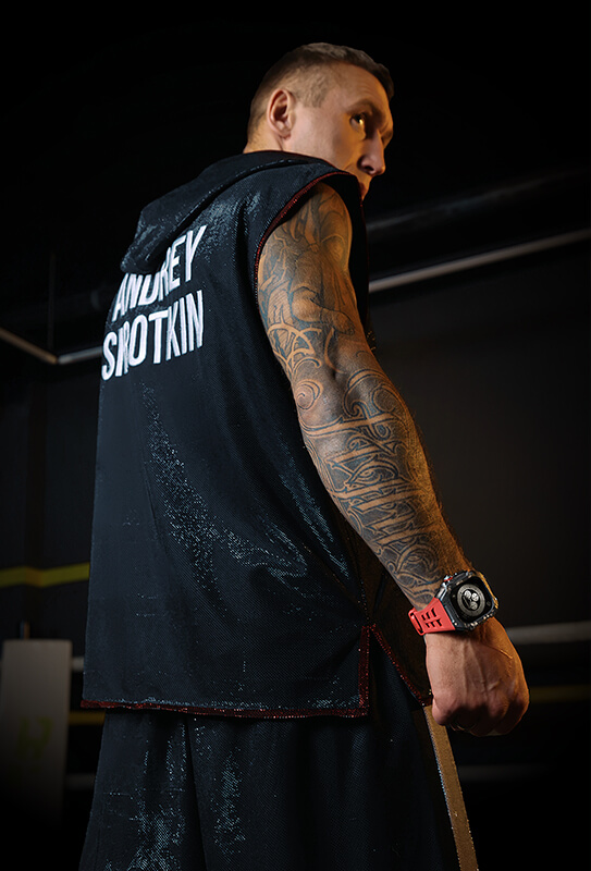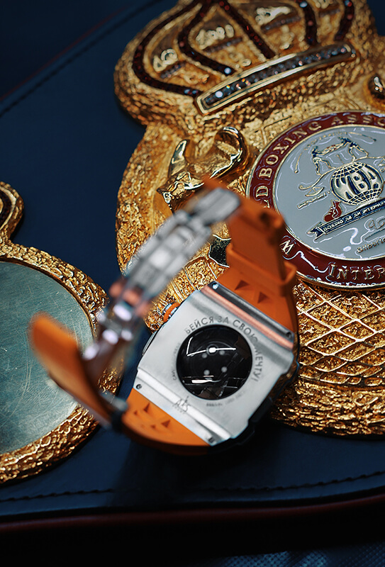 Стальной кейс Airspace надежно защищает часы от случайных ударов и повреждений, а каучуковый ремешок обеспечивает комфортное ношение на руке. Благодаря динамичному дизайну, часы выглядят необычайно стильно, отражая чемпионский характер владельца. Специально для Андрея была создана персонализированная версия Airspace Orange с индивидуальной гравировкой: "Бейся за свою мечту".