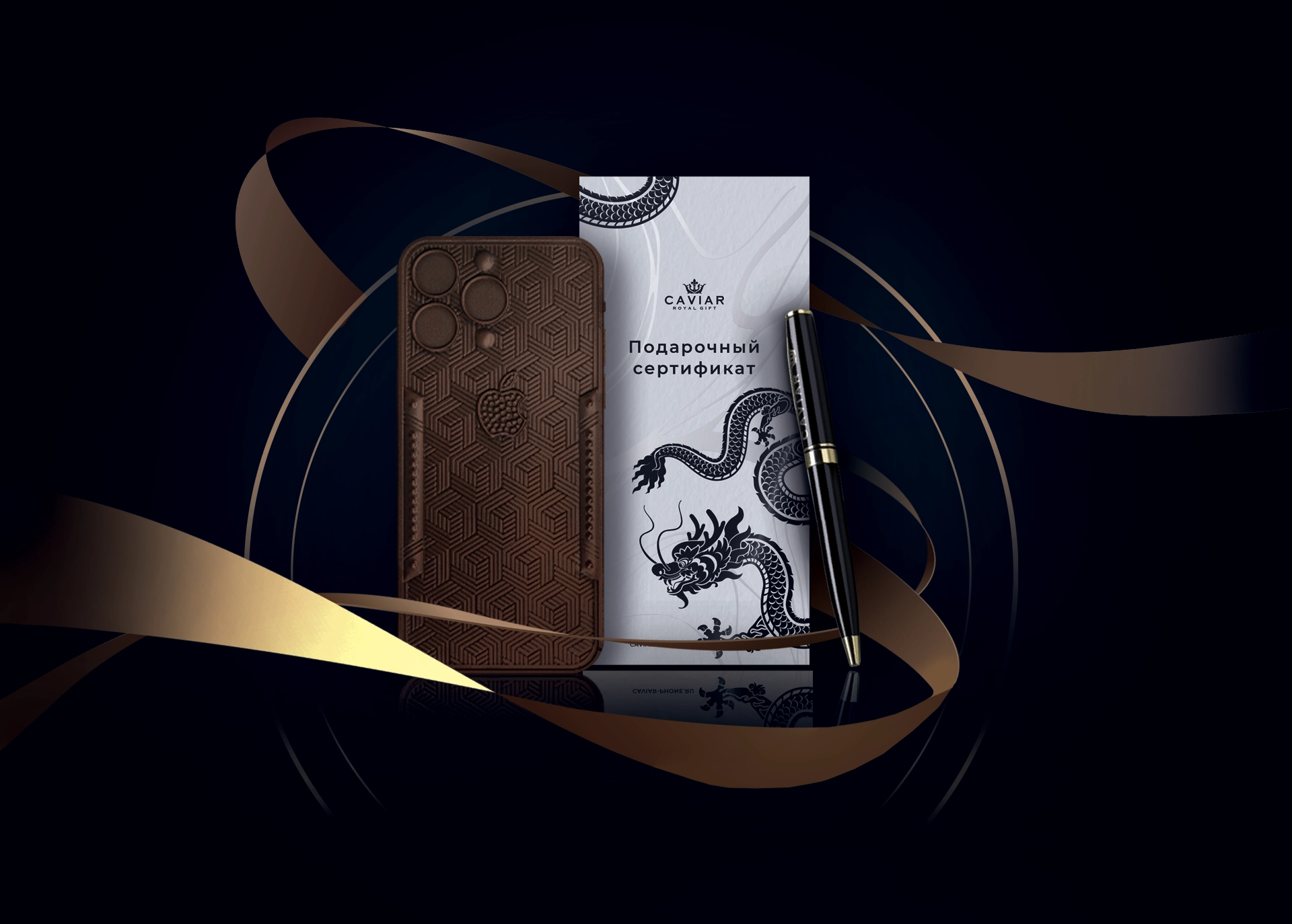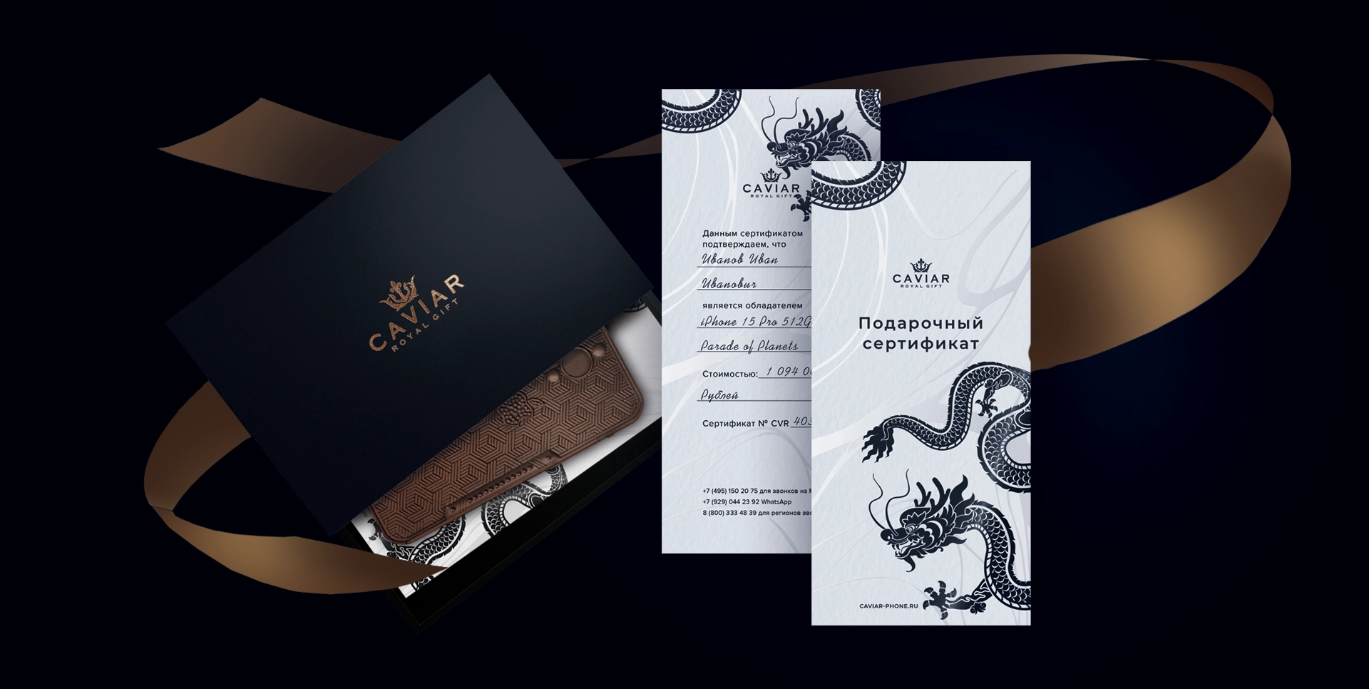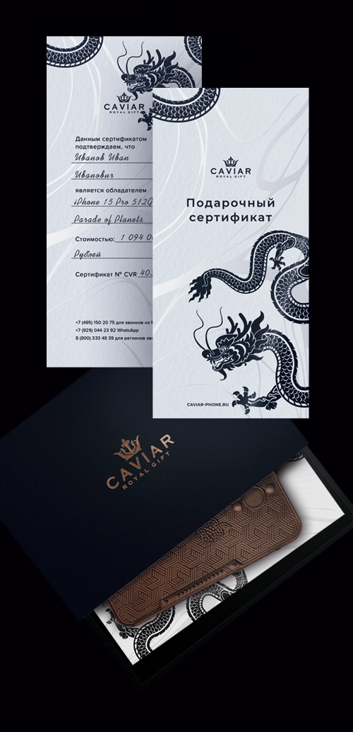 Вы получите именной сертификат с названием телефона и стоимостью. В подарочный набор входят эксклюзивный шоколад и ручка от Caviar.