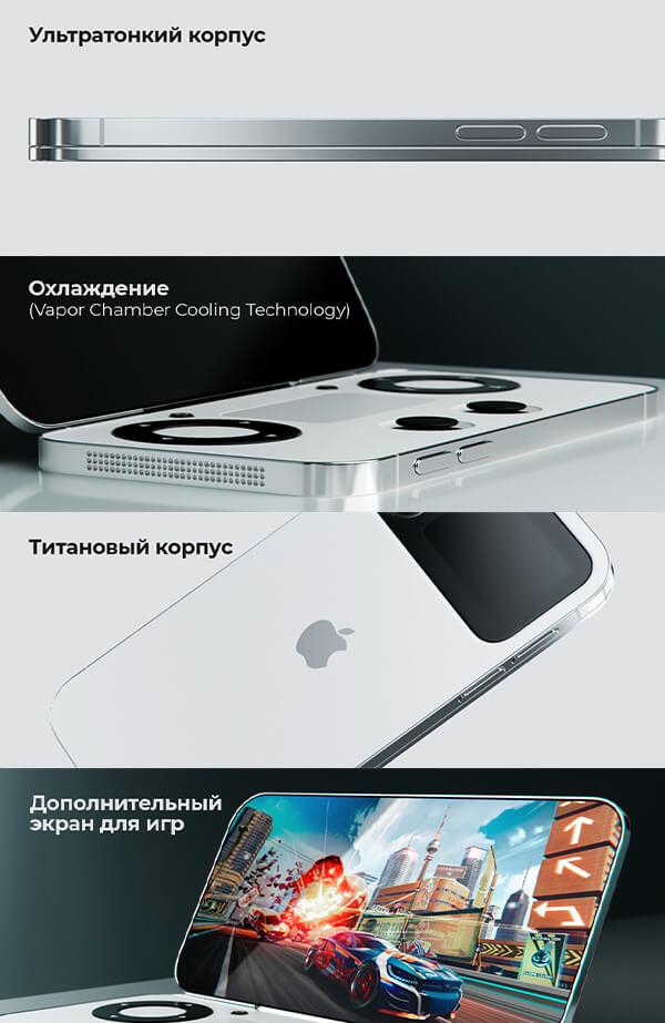 Этот смелый концепт получил название iPhone 14 Pro Switch, ведь он совместил в себе функции смартфона и игровой консоли. В дизайне мы учли самые частые пожелания поклонников Apple – в модели отсутствуют разъемы и “челка”, переработан дизайн фронтальной камеры, которая теперь не выступает из корпуса, вернулся Touch ID, который теперь расположен под экраном, а вся модель надежно защищена прочным титановым корпусом.